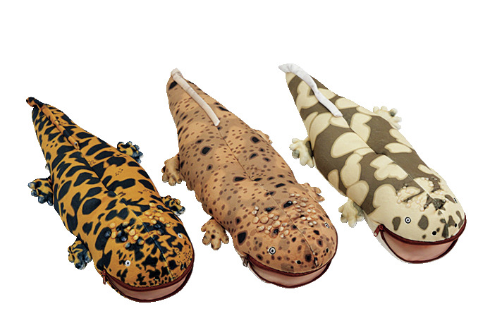 西川さんは普及のためにオオサンショウウオのぬいぐるみを監修。購入すると日本産の保護に貢献する仕組み。左から日本産、交雑個体、中国産。各3600円(税別)。