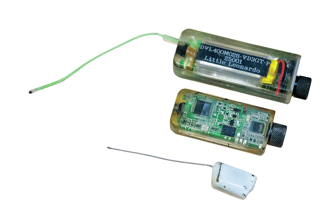 バイオロギング装置は目的ごとに種類がある。上は温度計付き、中央は体の細かい動きがわかる加速度計付きビデオロガー、下はGPS。
