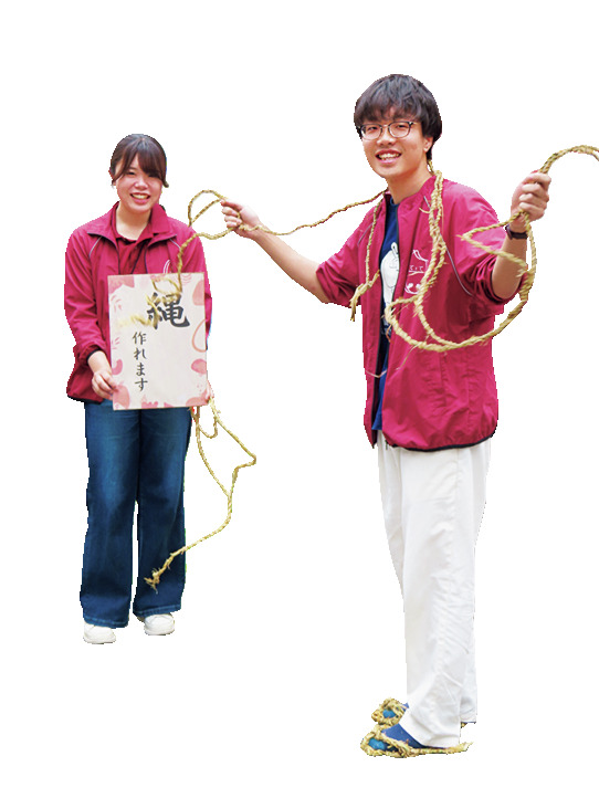 藁をより合わせ、縄にする。経験を積んだ矢澤さんは1分程度で藁1本分の縄をなえるが、初めての人は15分ぐらいかかる。