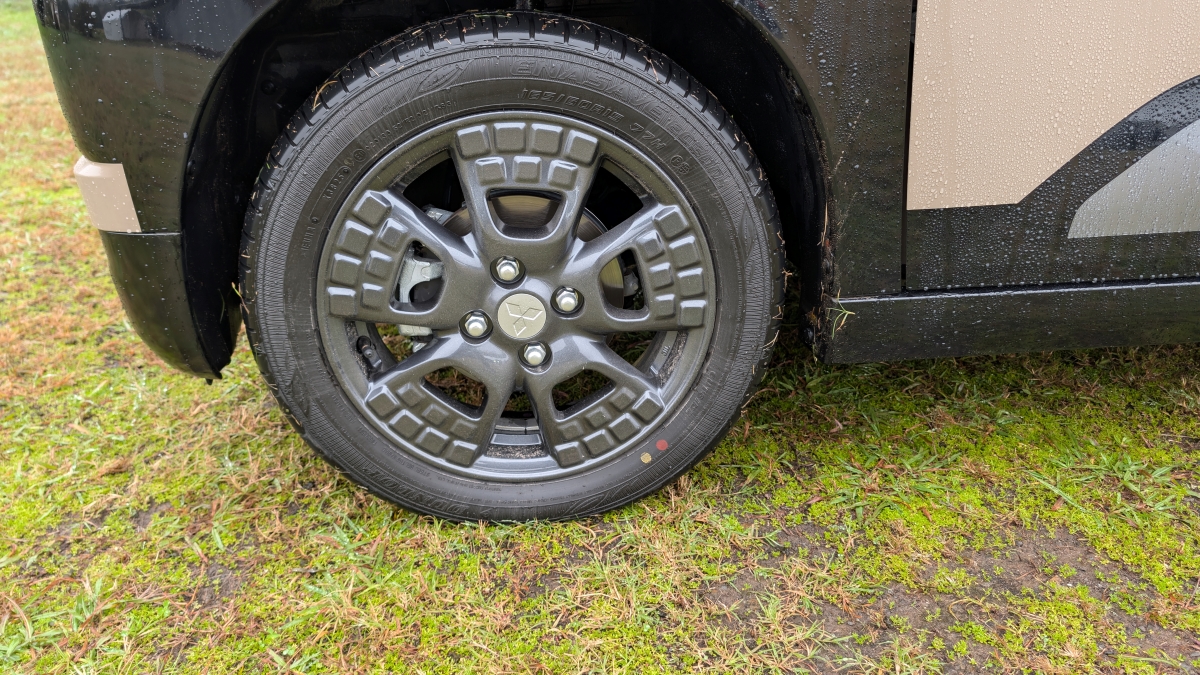 4WD車の15インチアルミホイール。タイヤサイズは165の60で15インチなんだが、これが物凄い効いてます。
