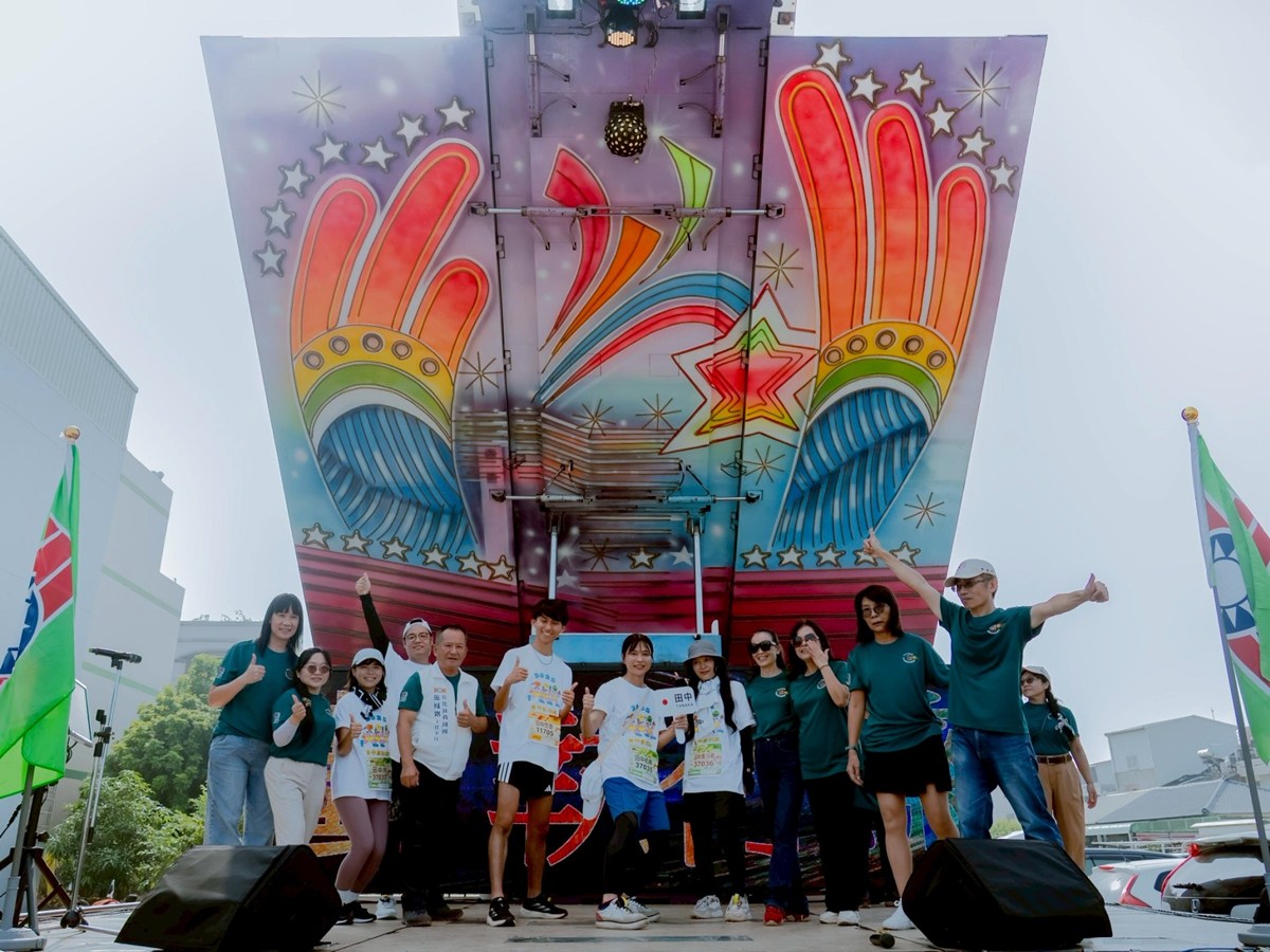 田中住民総出でのお出迎えも実に豪華……というか、想像の斜め上。例えばデコトラ上で踊りながら応援していた方々は、田中さんご一行を見かけると「ぜひステージに上がっていって」と自らのデコトラにご招待。田中さんご一行は、急遽、デコトラのステージ上で、初対面の応援団たちと共に写真に納まることになりました。