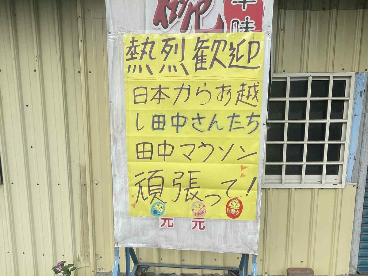 ほかにも沿線には、「日本からお越しの田中さんたち、田中マラソンがんばって!」と日本語で書かれている看板が設置されていたり、「加油!(中国語で頑張れの意味)」という紙を掲げて手を振るおばあちゃんがいたりと、みなさん、思い思いのスタイルで応援。