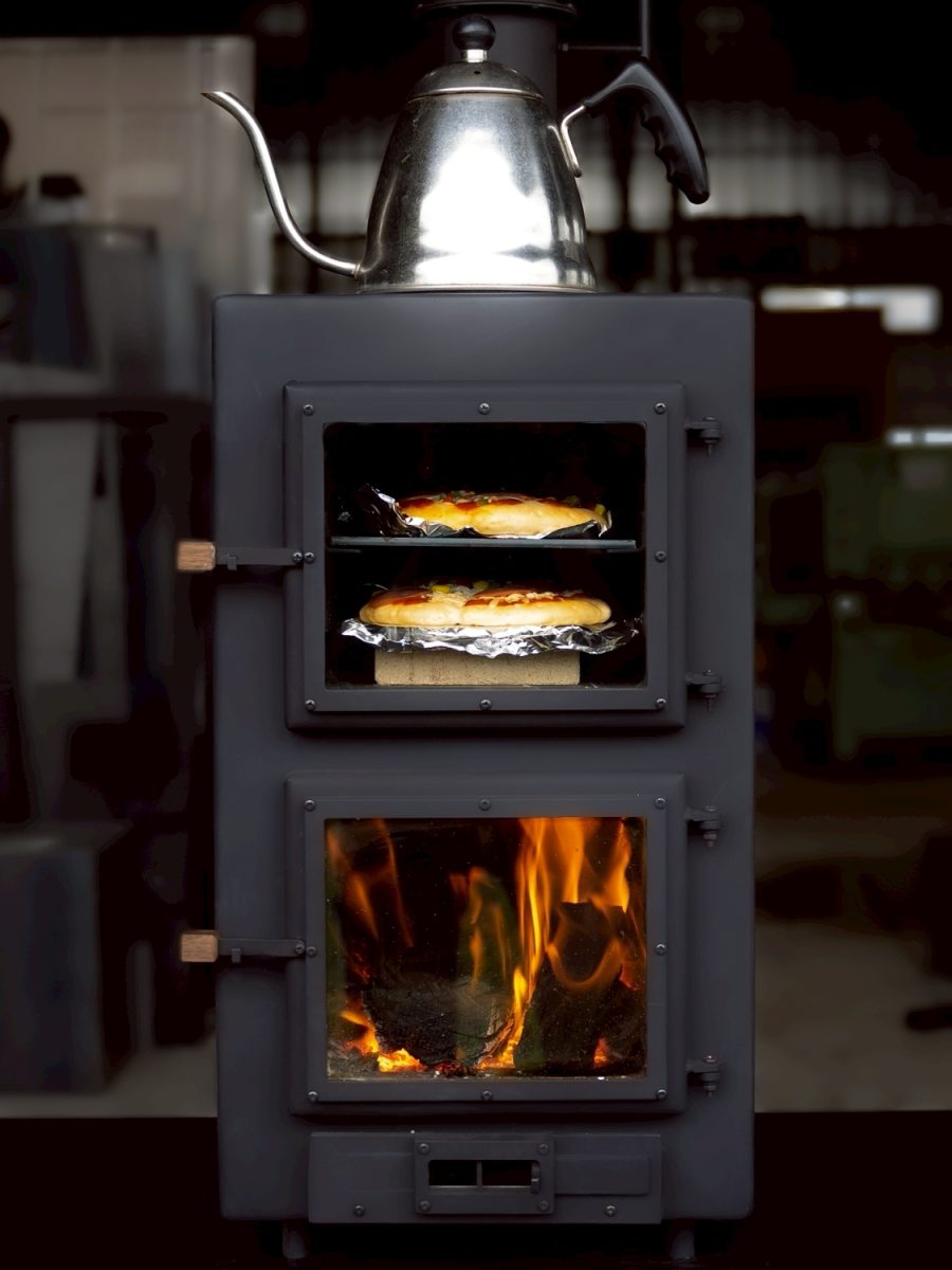 Dr.Craftは小さな薪ストーブだけでない。例えば幅300mm×高さ550mm奥行360mmのやや大きめサイズ「DC-CM」も展開している(重量50㎏)。こちらは暖房&調理可能なクッキング用薪ストーブで、オーブン室ではピザを焼け、トップではお湯が沸かせる仕様だ。