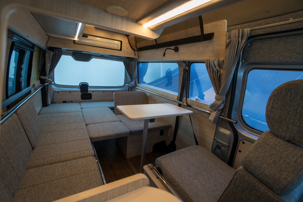 キッチンを前方に配置することのメリットは、エントランスからのアクセス性のよさはもちろん、車両後部をすべてリビングスペースや就寝スペースとして使えること。アルテ6も単座のキャンピングカー専用シートと後方のマットを使って対面対座ができるだけでなく、横座り3人シートもあるため、5人でコの字型のリビングでゆったりと食事などができます。テーブルも脱着式になっており、シチュエーションに応じて、前・後に付け替えることができるのもとっても便利。
