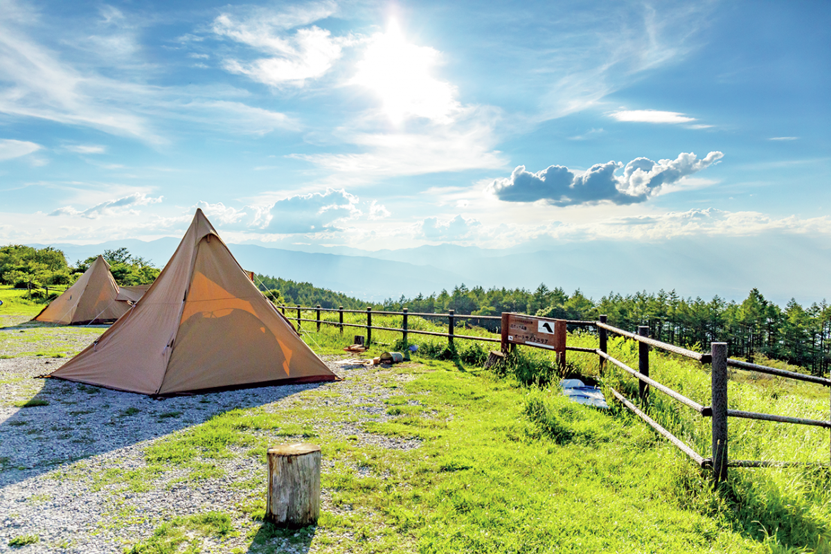 気持ちいい風を浴びながら、絶景を望む高原で遊び尽くせる、日本一標高の高いキャンプ場。目の前には、甲斐駒ヶ岳や八ヶ岳を望む。「雲の上エリア」という特別なサイトは1日6組限定。昼間は高原サイクリング、夜は無数の星空を眺めるなど、アクティビティも豊富だ。