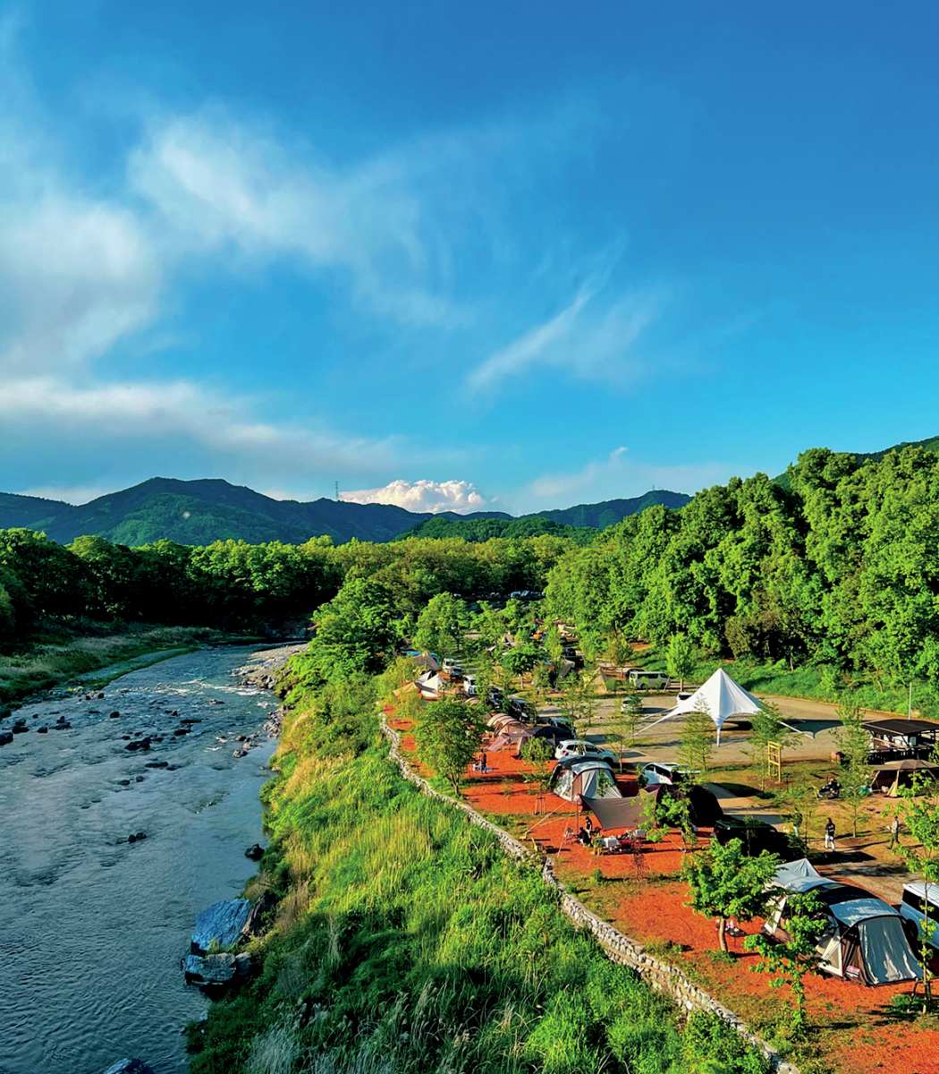 那珂川を見下ろす山の高台にあるキャンプ場。清流・那珂川の流域でとくに渓谷美が随一とされる、鎌倉山からの眺望が場内から楽しめる。また、秋から冬にかけて雲海が出現することもあり、それもまた絶景だ。