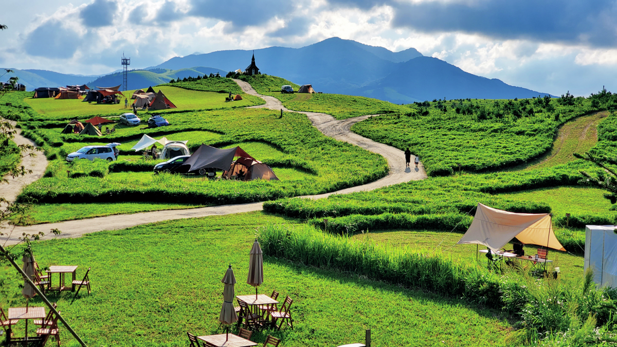 緑豊かな草原、丘の上のチャペルなど、まるでヨーロッパの田舎に来たような景色が広がる。常設のドームテントやサウナ、露天風呂などグランピング設備も充実しており、リゾート気分も味わえる。