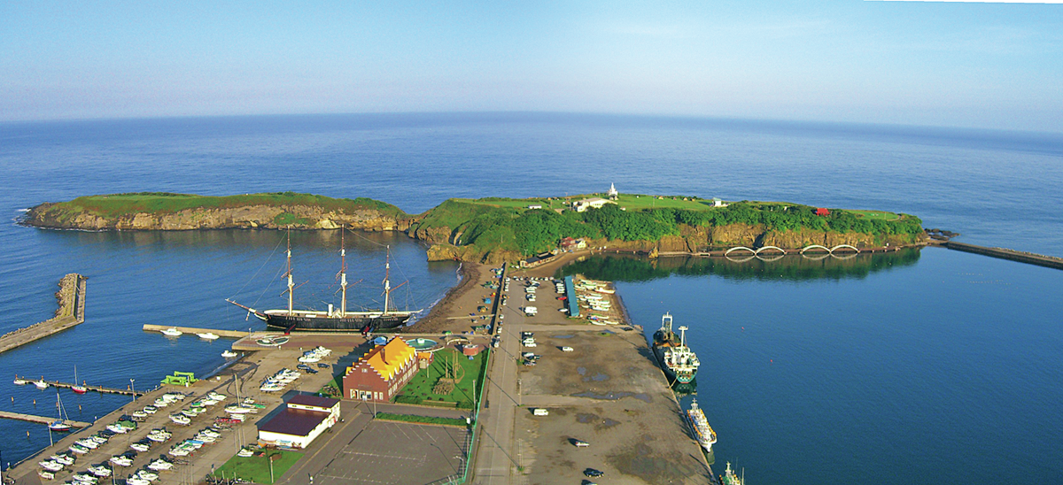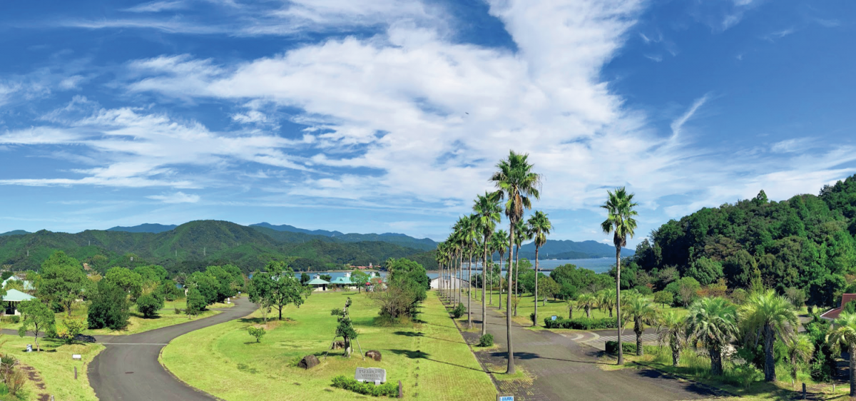 ハワイのような南国ムード漂うヤシの木が出迎えてくれるキャンプ場は、小高い丘より太平洋のオーシャンビューを望める。近くには世界初の線路と道路を走るDMV、海中観光船ブルーマリンなどの体験スポットも。