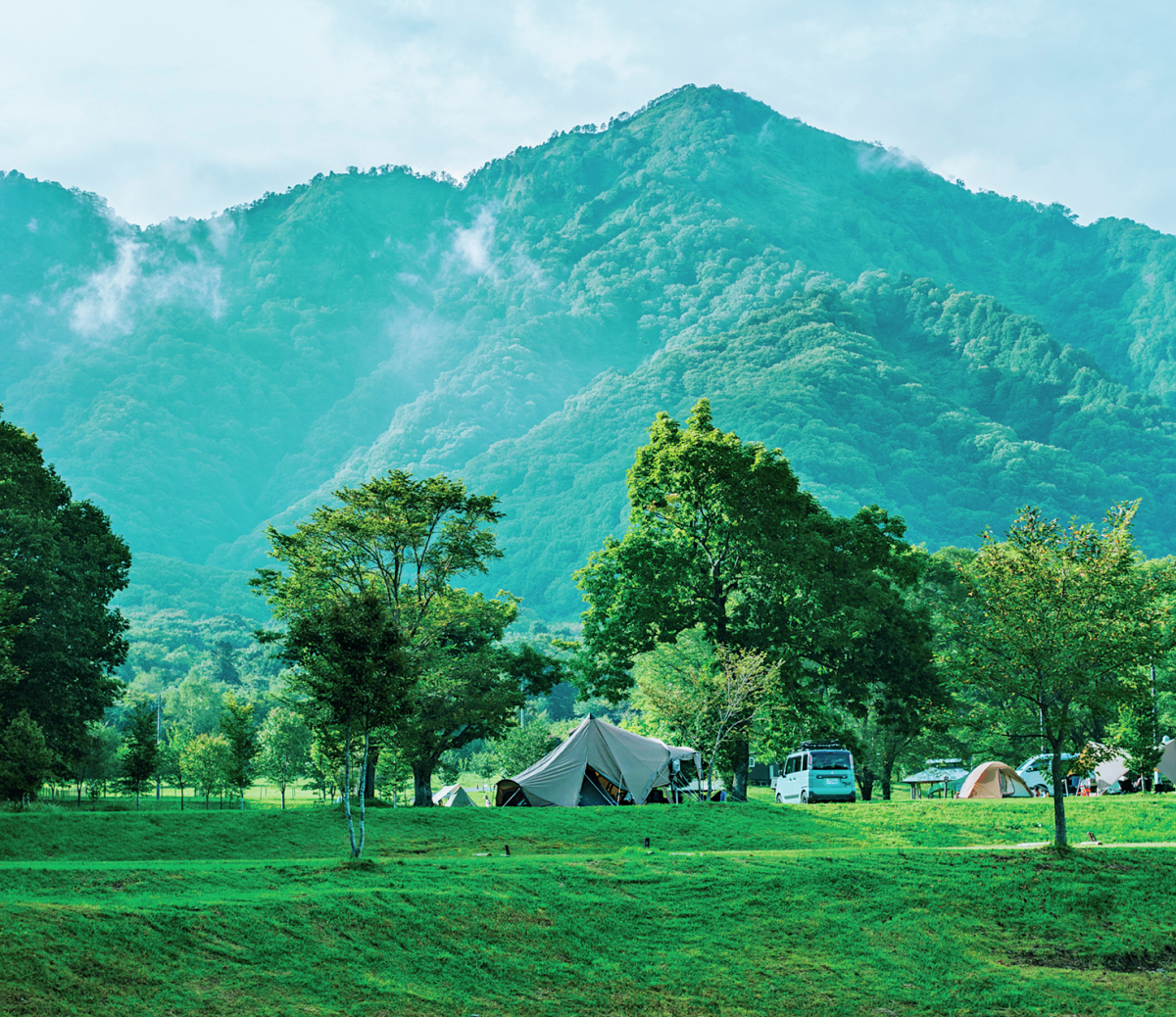 戦国時代に武田軍のノロシ台があったと伝えられる陣馬形山の山頂付近に立地。SNSで話題になり瞬く間に人気に。場内は4段の棚田状で、下から2段目は共有広場、ほかの3段がテントサイトとなっている。車の横付けはできないが、目の前を遮るものがなく、パノラマビューが楽しめる。