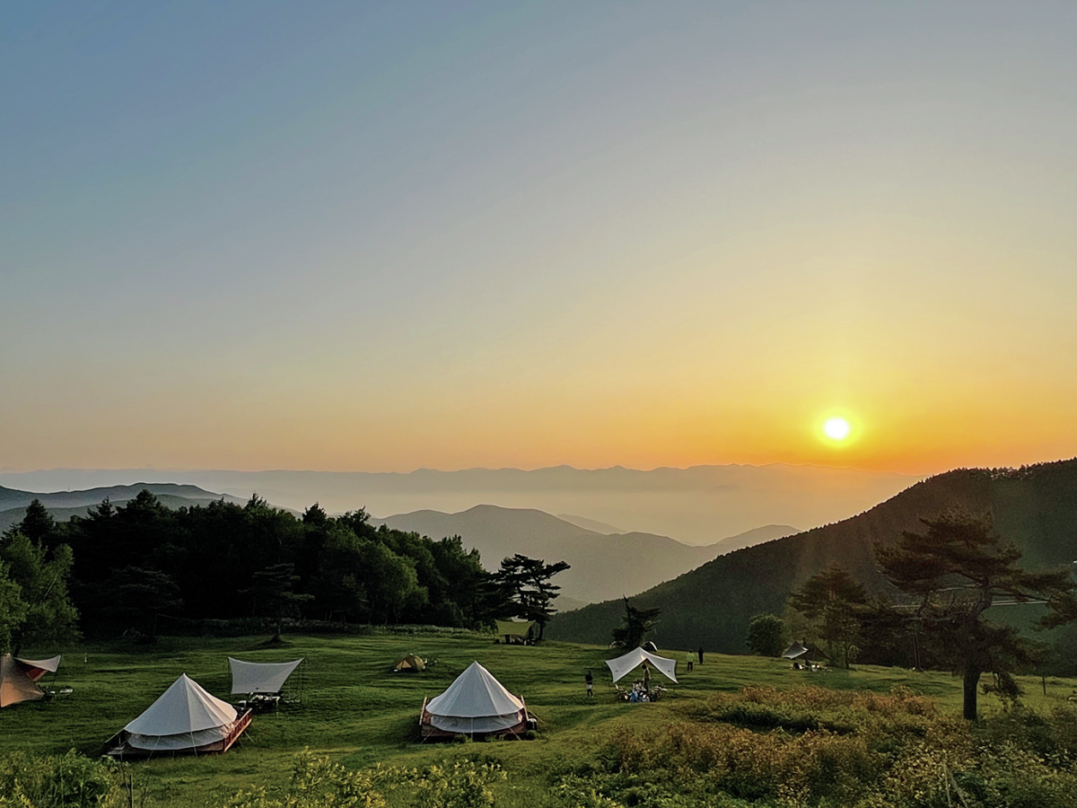 標高1,600mの高原にあり、全面芝生の開放感が魅力のキャンプ場。高確率で出現し目の前に広がる雲海や、北アルプスに沈んでいく夕日、さらに晴れた夜は肉眼で天の川も見られるなど、まさに絶景のオンパレードを楽しめる。