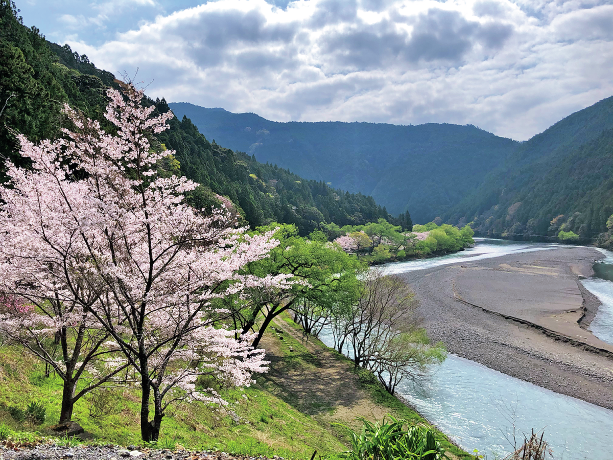 気田川の景色とサクラを楽しみたければ、キャンプ場入り口の高台に位置する絶景のスーパーコアサイトもオススメだ。