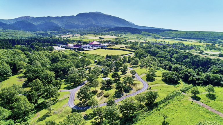 大分県湯布院と熊本県阿蘇を結ぶ「やまなみハイウェイ」の中間地点にある「瀬の本レストハウス」に隣接。阿蘇カルデラの北外輪山に位置し、くじゅう連山や阿蘇山などの登山基地にぴったり。