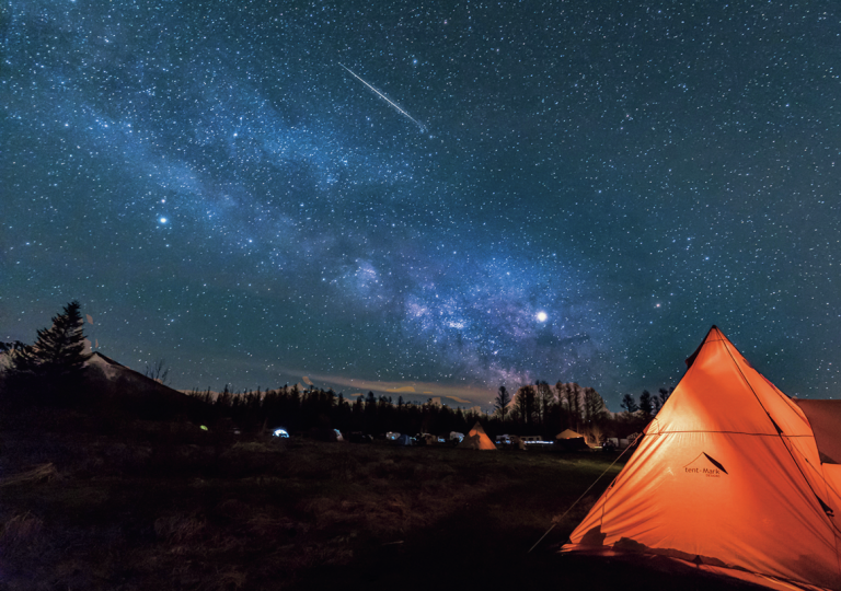富良野岳や十勝連峰など雄大な峰々を望む立地。星空はもちろん雲海や夕日、様々な自然の表情が楽しめる。キャンプ場は極力場内の灯りを抑えていて、星空観察を後押し!