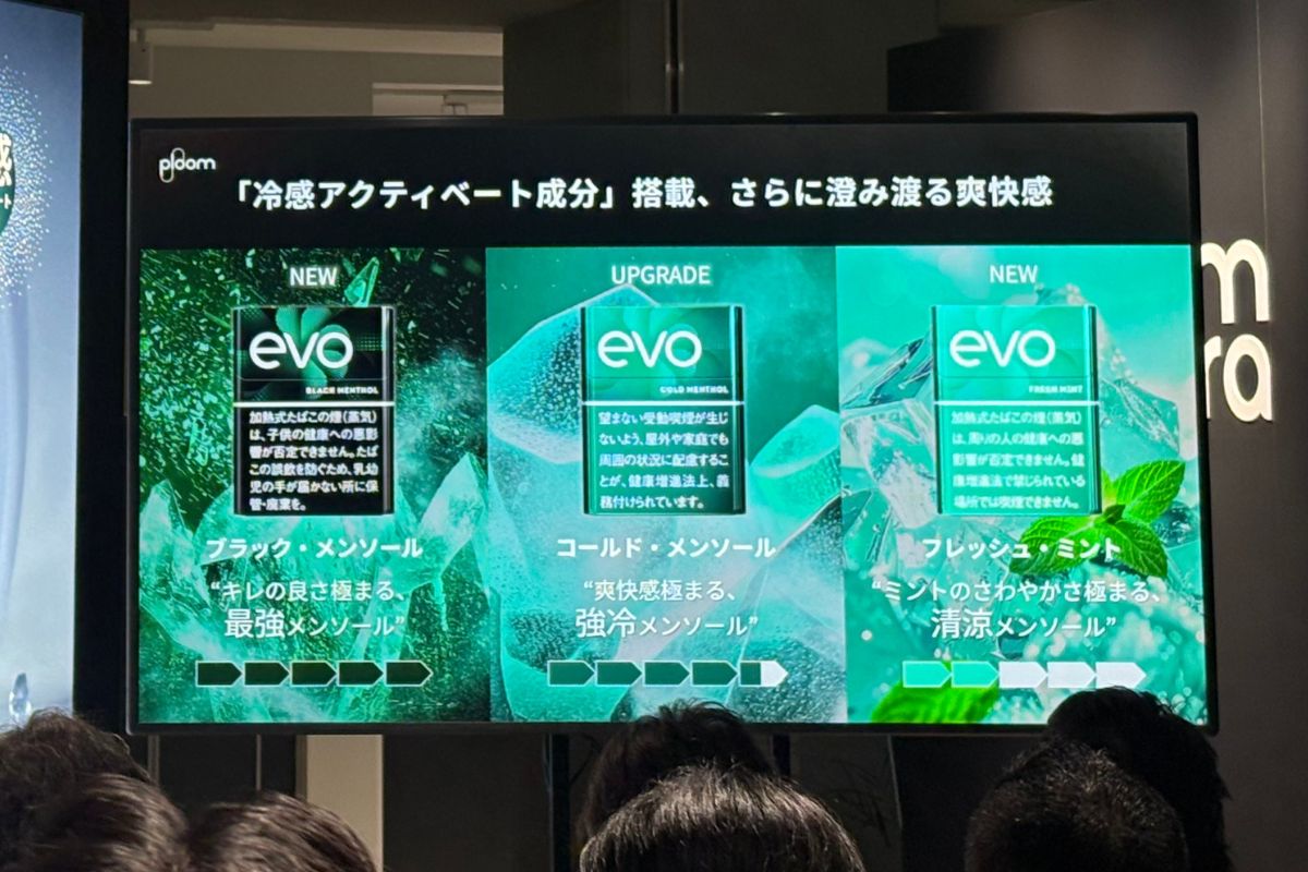 JT の「Ploom(プルーム)」専用の新加熱式たばこスティックブランド「EVO(エボ)」から、「エボ・ブラック・メンソール」「エボ・フレッシュ・ミント」の 2銘柄を順次発売。2025年12月1日より順次、全国のコンビニエンスストア及びたばこ販売店等にて発売される。