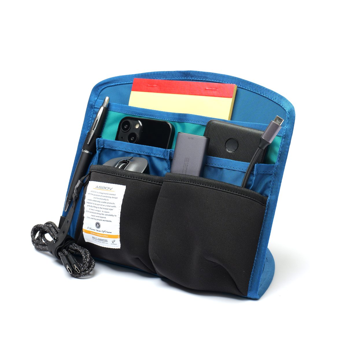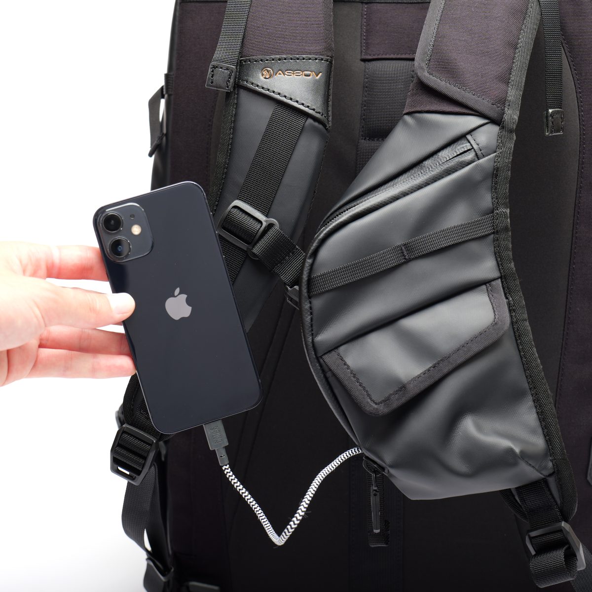 モバイルバッテリーと接続して、スマートフォンを収納しながら充電できるポケットを装備。