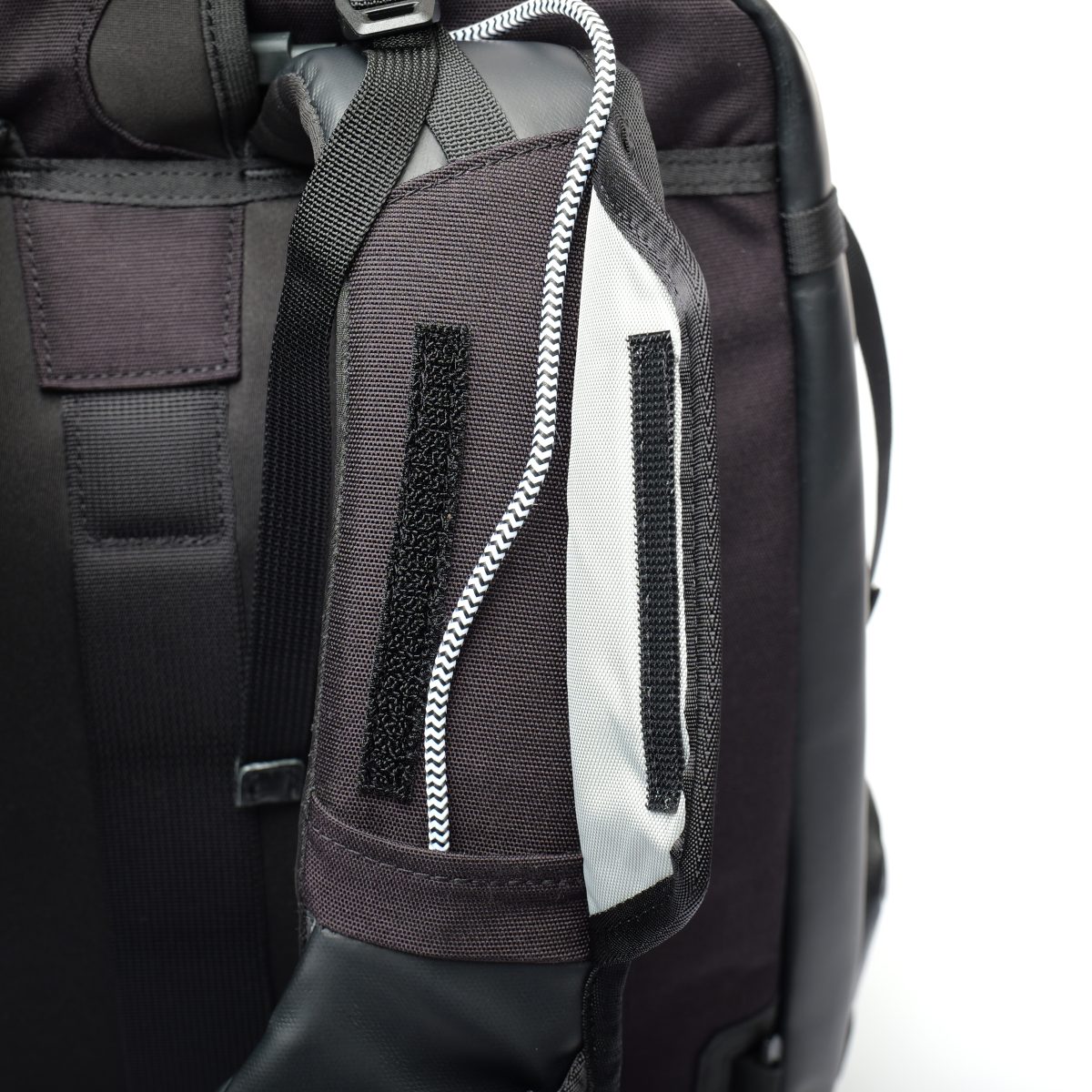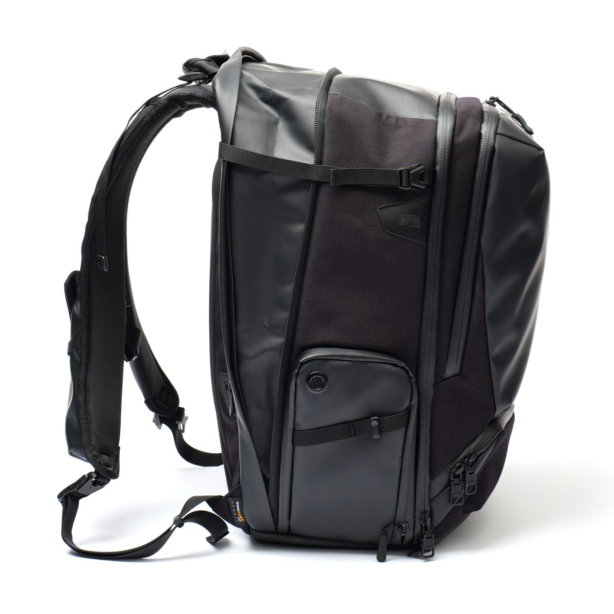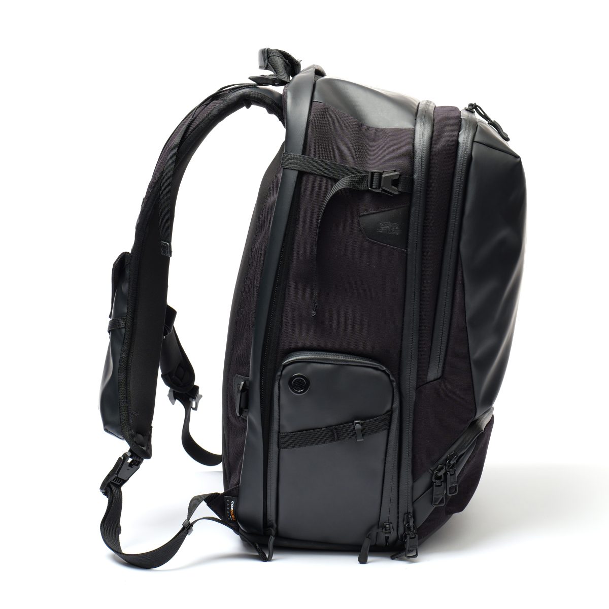 摩擦や傷に強いポリカーボネートをラミネートしたファブリック。タフな環境や旅先でも安心して使える仕上がりとなっている。