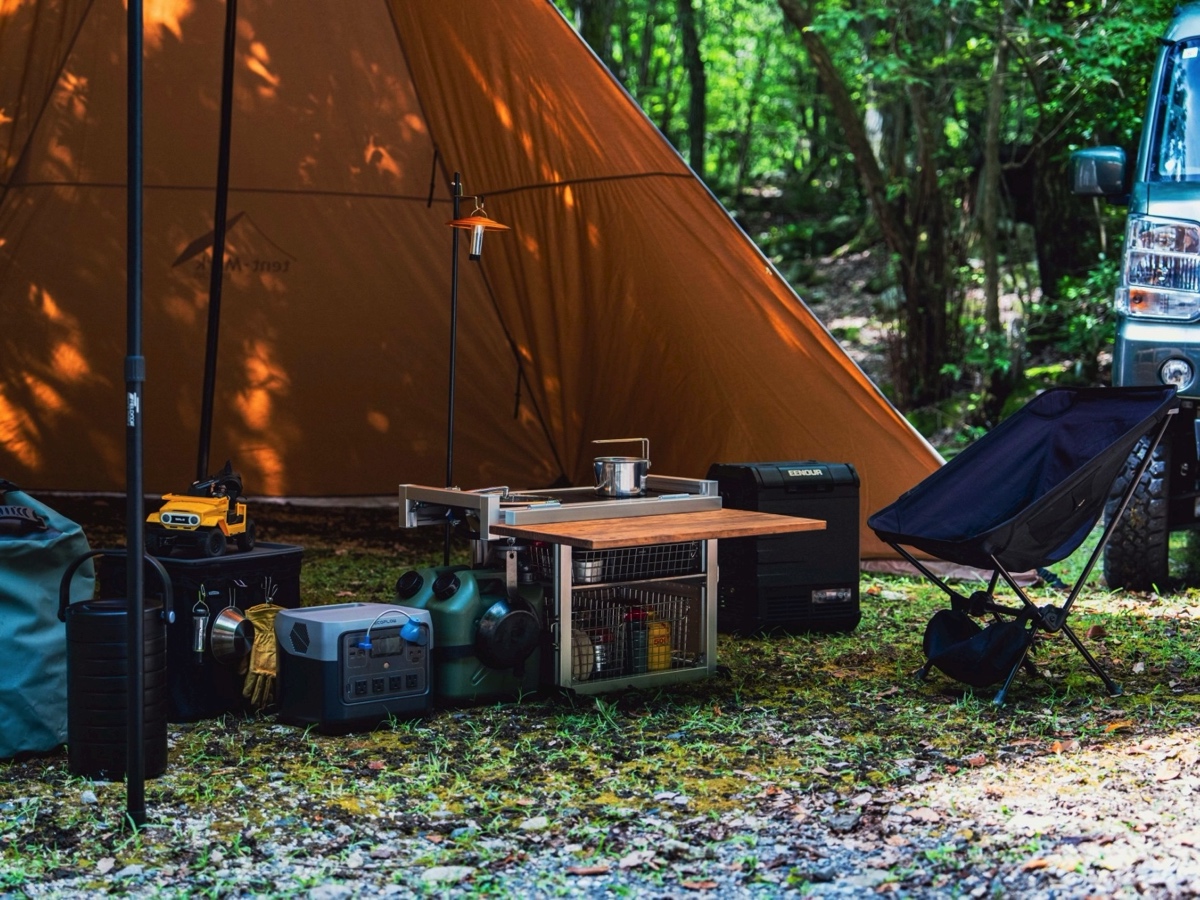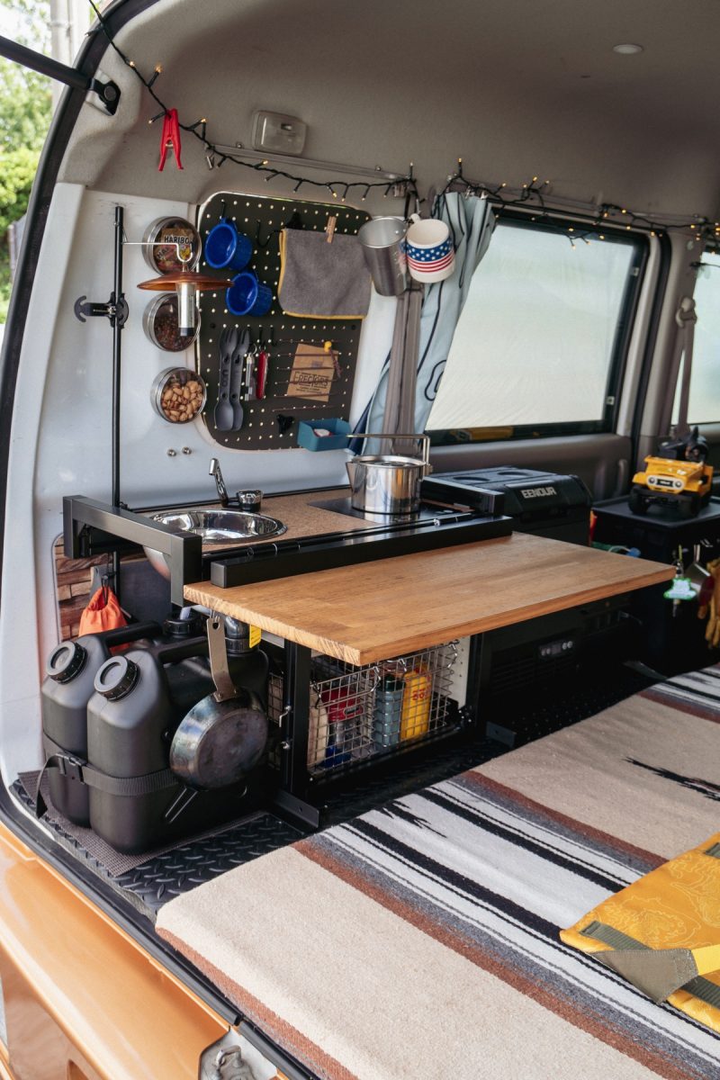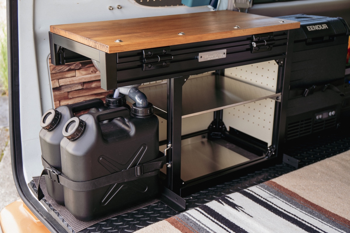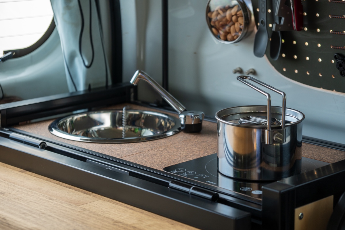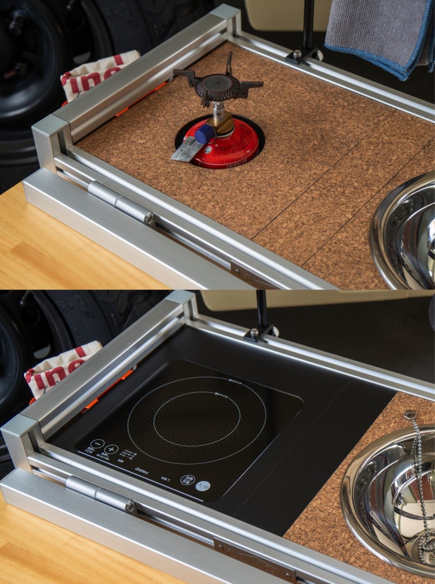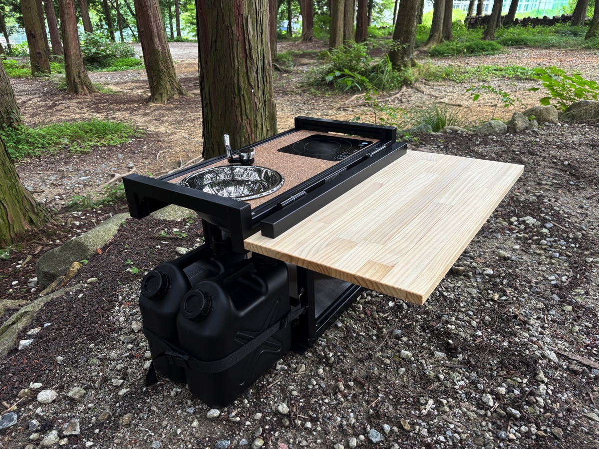 上の写真を見てもわかるように、パッと見ただけだとコンパクトなキャビネットです。でも、内部には開閉式テーブルをはじめ、電動ポンプ付き蛇口やシンク、給排水タンク、IHコンロに加え、2段トレーが備わるなど、機能が満載。このキャビネットを愛車にポンッと置くだけで、たちまち本格キャンピングカーのような車内へとはや変わり。車内でIHコンロを使って調理したり、テーブルで食事や仕事なんてこともできるし、カトラリーやLEDライトといった小物もキャビネット内のトレーで整とんできます。
