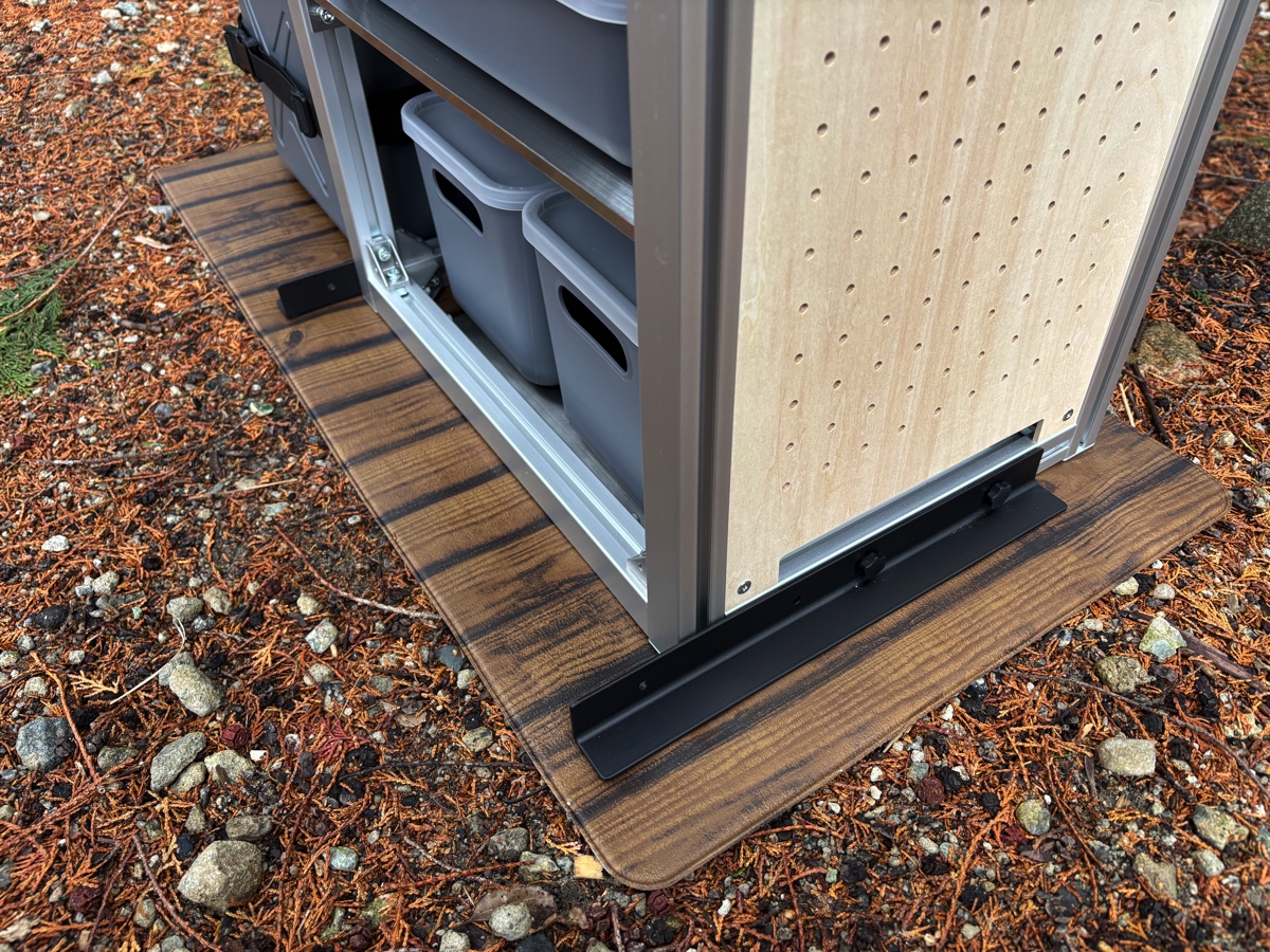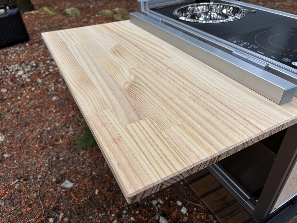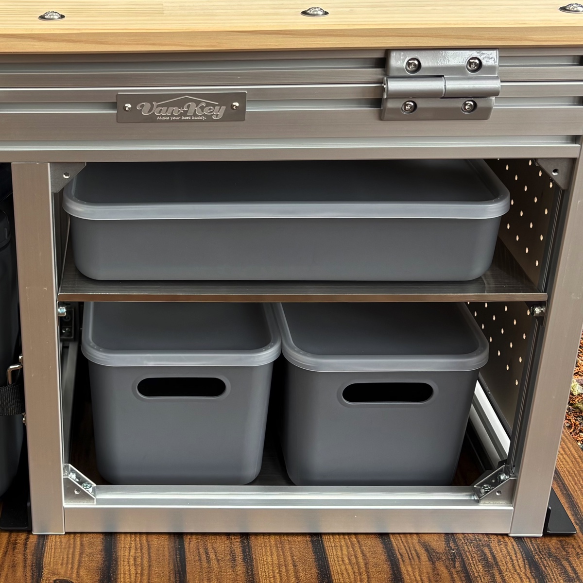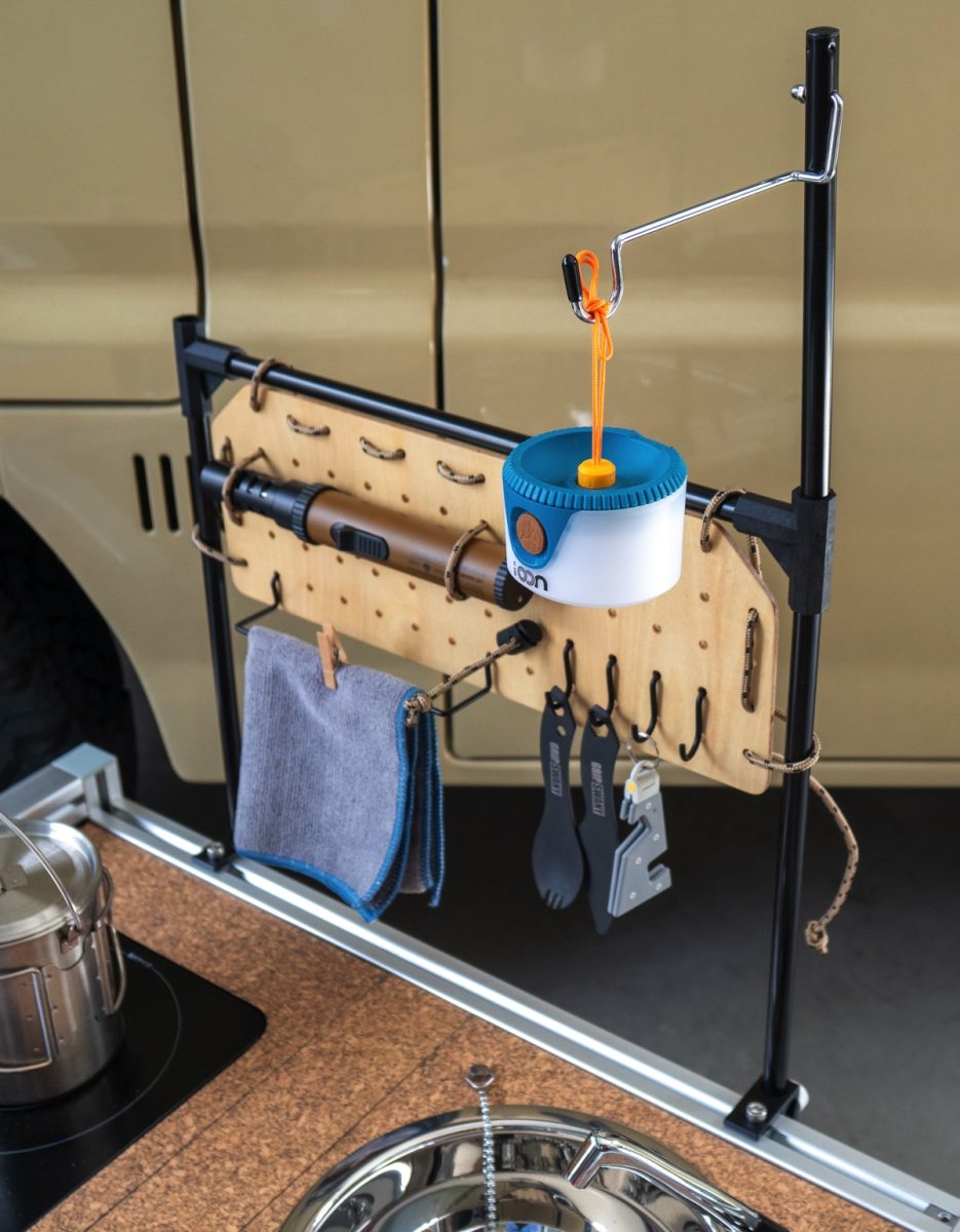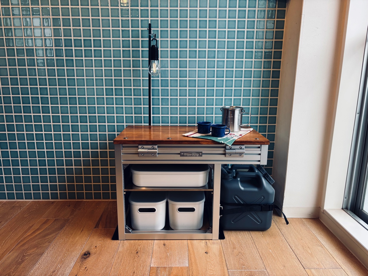 上の写真を見てもわかるように、パッと見ただけだとコンパクトなキャビネットです。でも、内部には開閉式テーブルをはじめ、電動ポンプ付き蛇口やシンク、給排水タンク、IHコンロに加え、2段トレーが備わるなど、機能が満載。このキャビネットを愛車にポンッと置くだけで、たちまち本格キャンピングカーのような車内へとはや変わり。車内でIHコンロを使って調理したり、テーブルで食事や仕事なんてこともできるし、カトラリーやLEDライトといった小物もキャビネット内のトレーで整とんできます。