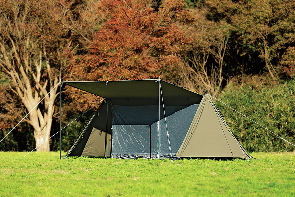 焚き火の火の粉にも強いポリエステルとコットンの混紡素材を使用。夏は涼しく、冬は暖かい。付属インナーテントはメッシュ素材で通気性バツグンだ。