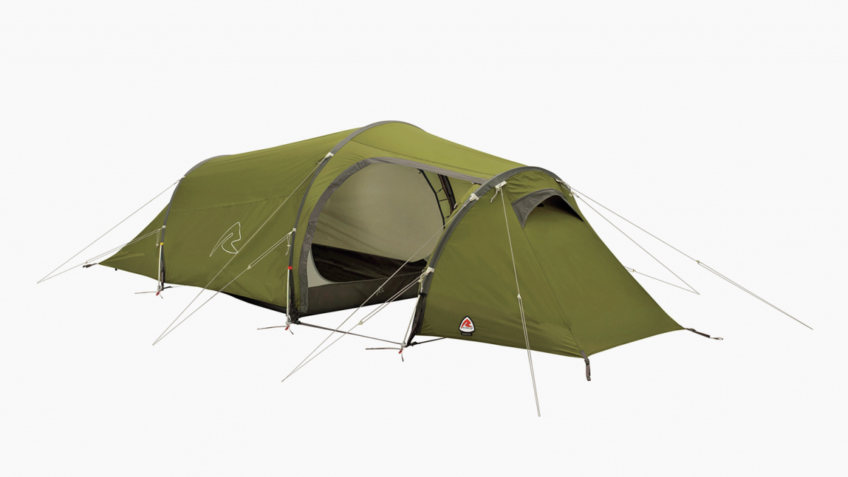 風速40mに耐えられる丈夫なトンネルテント。前室は寝室とほぼ同じ広さで、タープなしでもくつろげる。インナーには小物を干せるリッジライン付き。