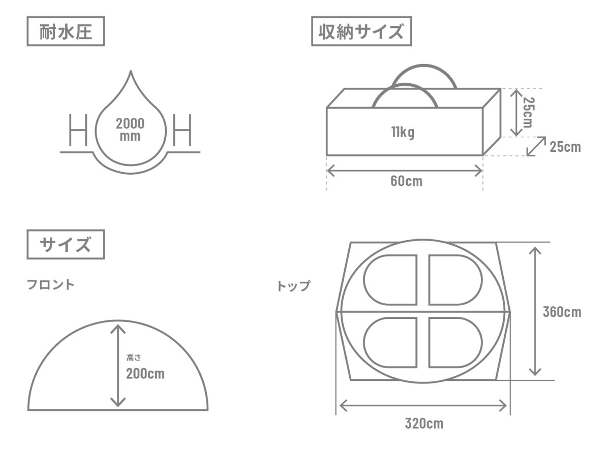 材質:テント生地・フライシート;5Dポリエステルリップストップ(PUコーティング)、煙突用生地;ポリエステル、グラスファイバー、シリコン、煙突口金具;ステンレス鋼、ポール;アルミ合金、ペグ;スチール、キャリーバッグ;150Dポリエステル(PUコーティング)