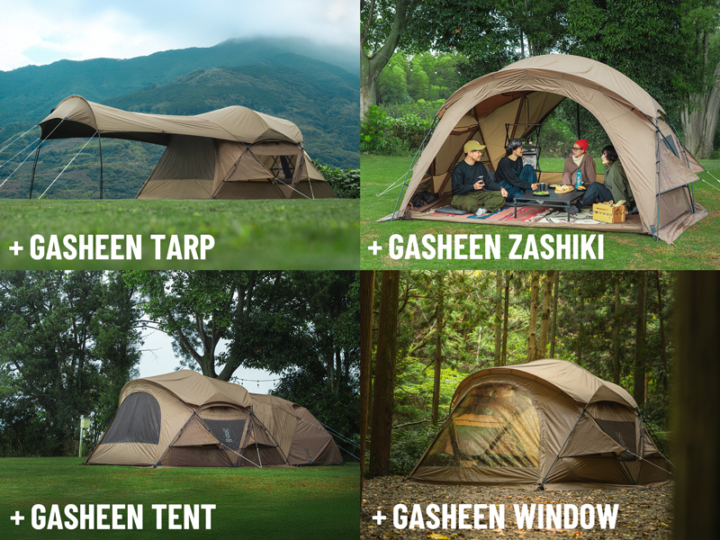 今回発売されたのは、キャンプスタイルに合わせて拡張できるドームシェルター「ガシーンドーム」と、専用オプション4アイテム。「ガシーンドーム」とオプション(テント、オープンタープ、フロアシート、TPU透明窓)を連結することで、2ルーム化やリビング拡張、お座敷化など、多様なスタイルにアレンジできるのが魅力だ。