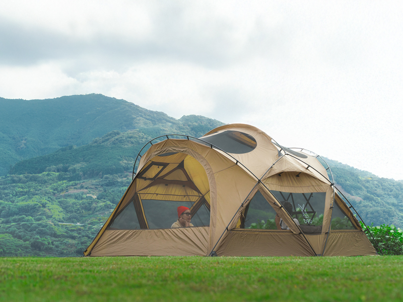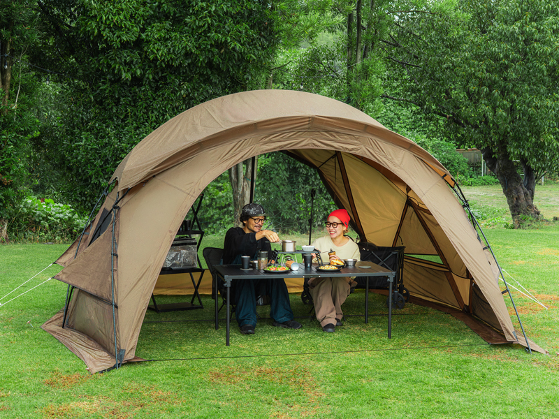 ドームの前に接続してリビングスペースを拡張。ドーム内へ雨が入りにくい形状で、遮光ブラックコーティングが夏の強い日差しをブロックする。