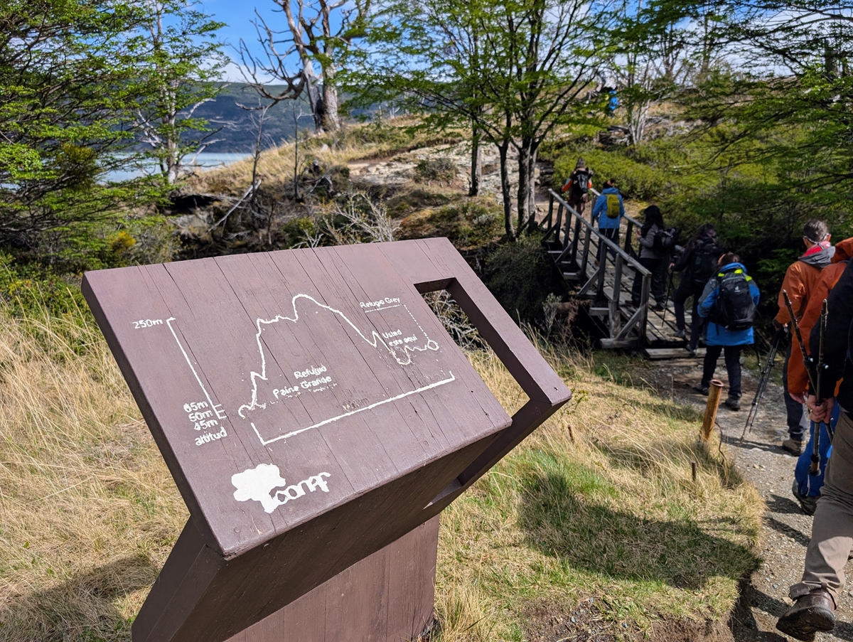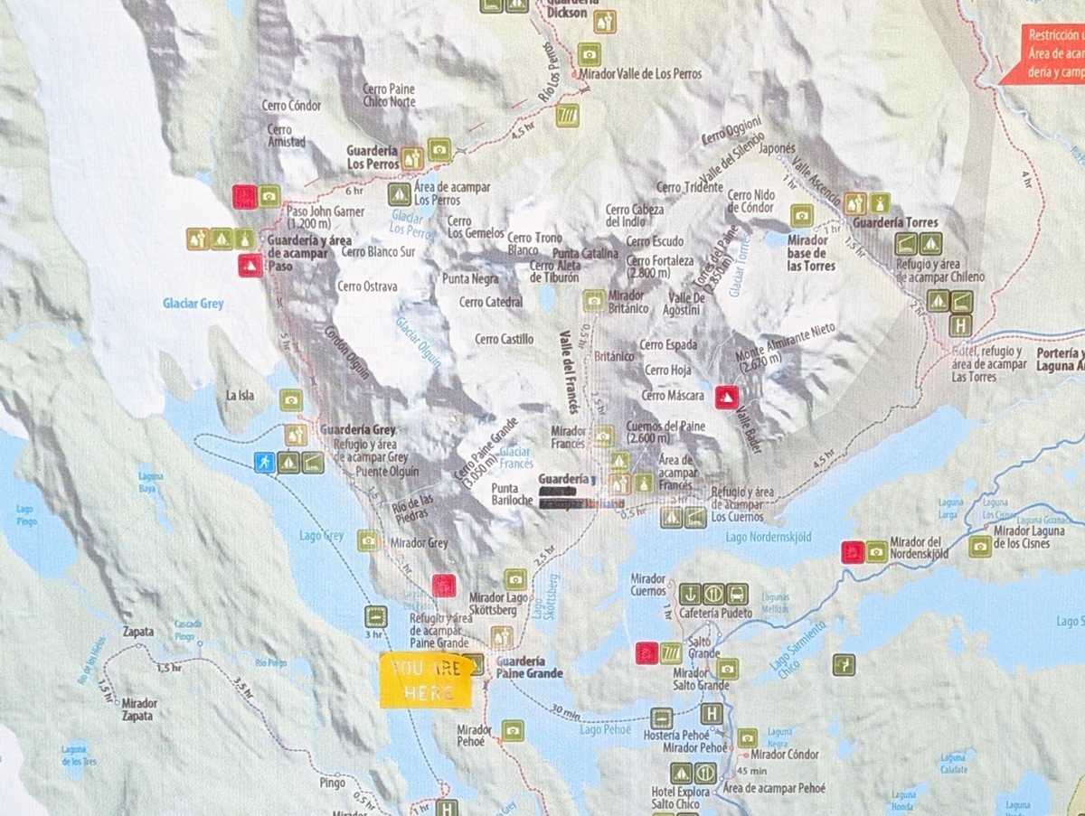 地図の中央下側にある「ペオエ湖(Lago Pehoe)を船で渡ってきて、「現在地」は黄色い文字の「You are here」の右肩あたり。ここから黒い点線で左上に向かう約11キロメートルのトレッキングコースです。