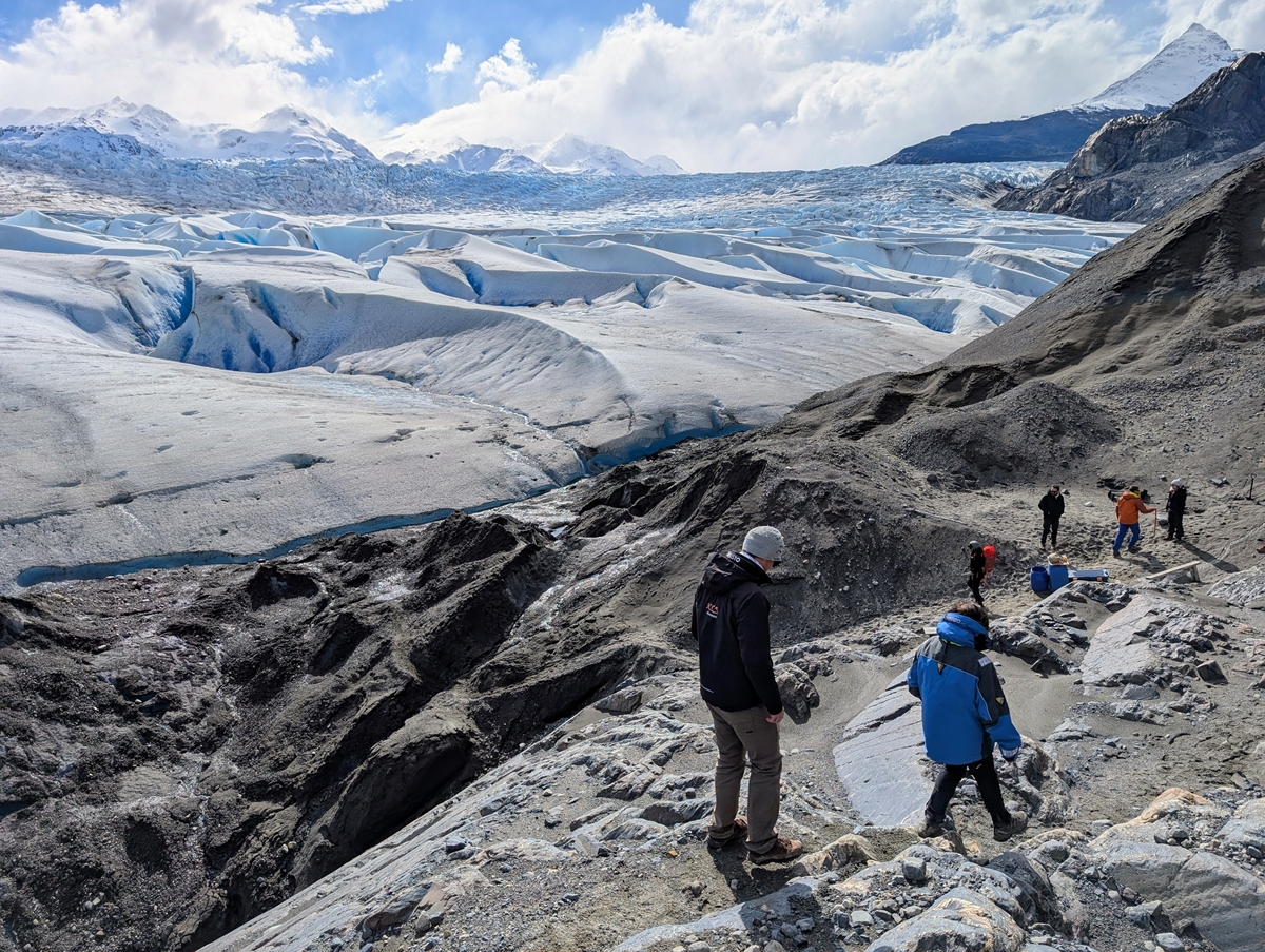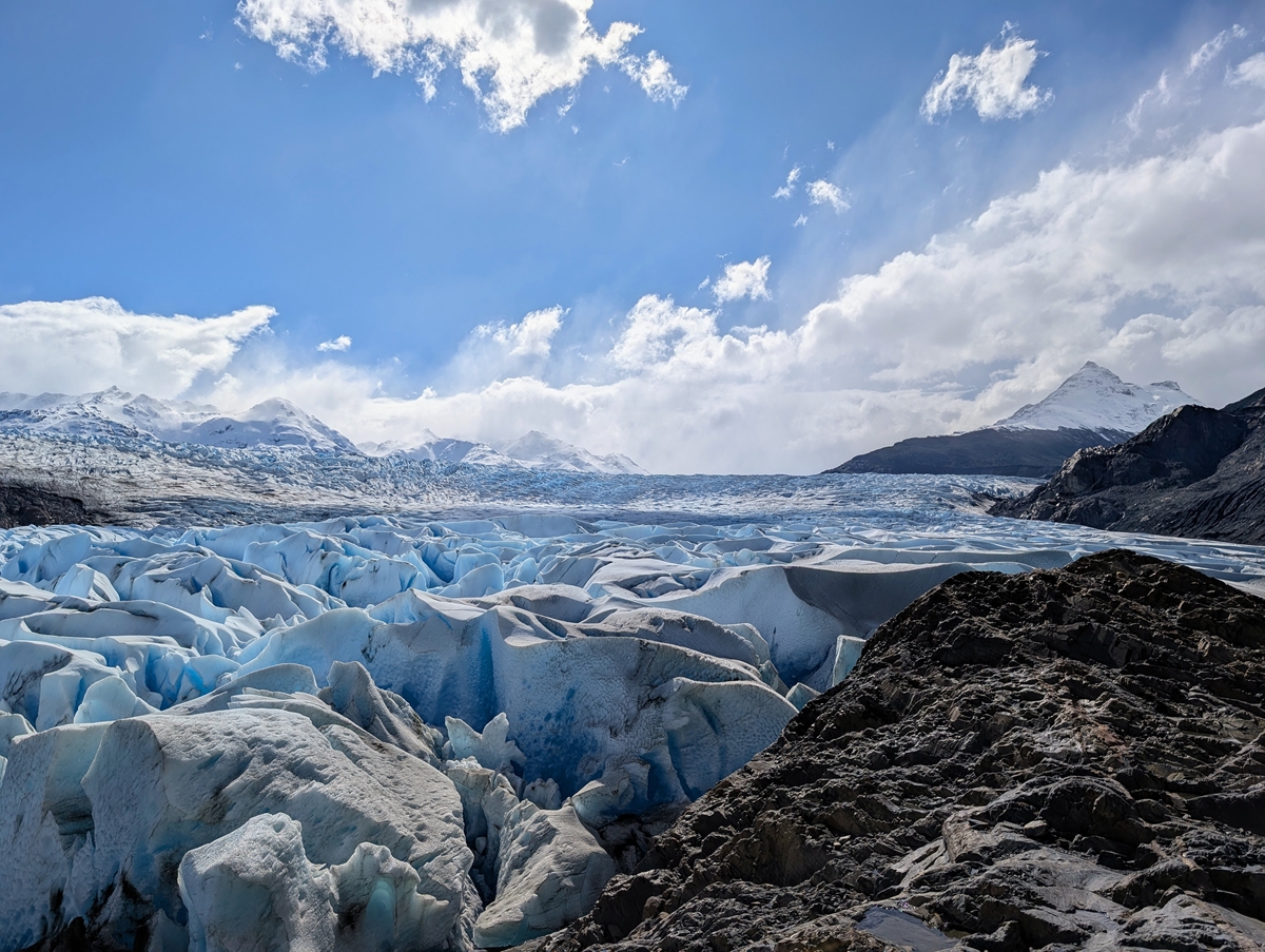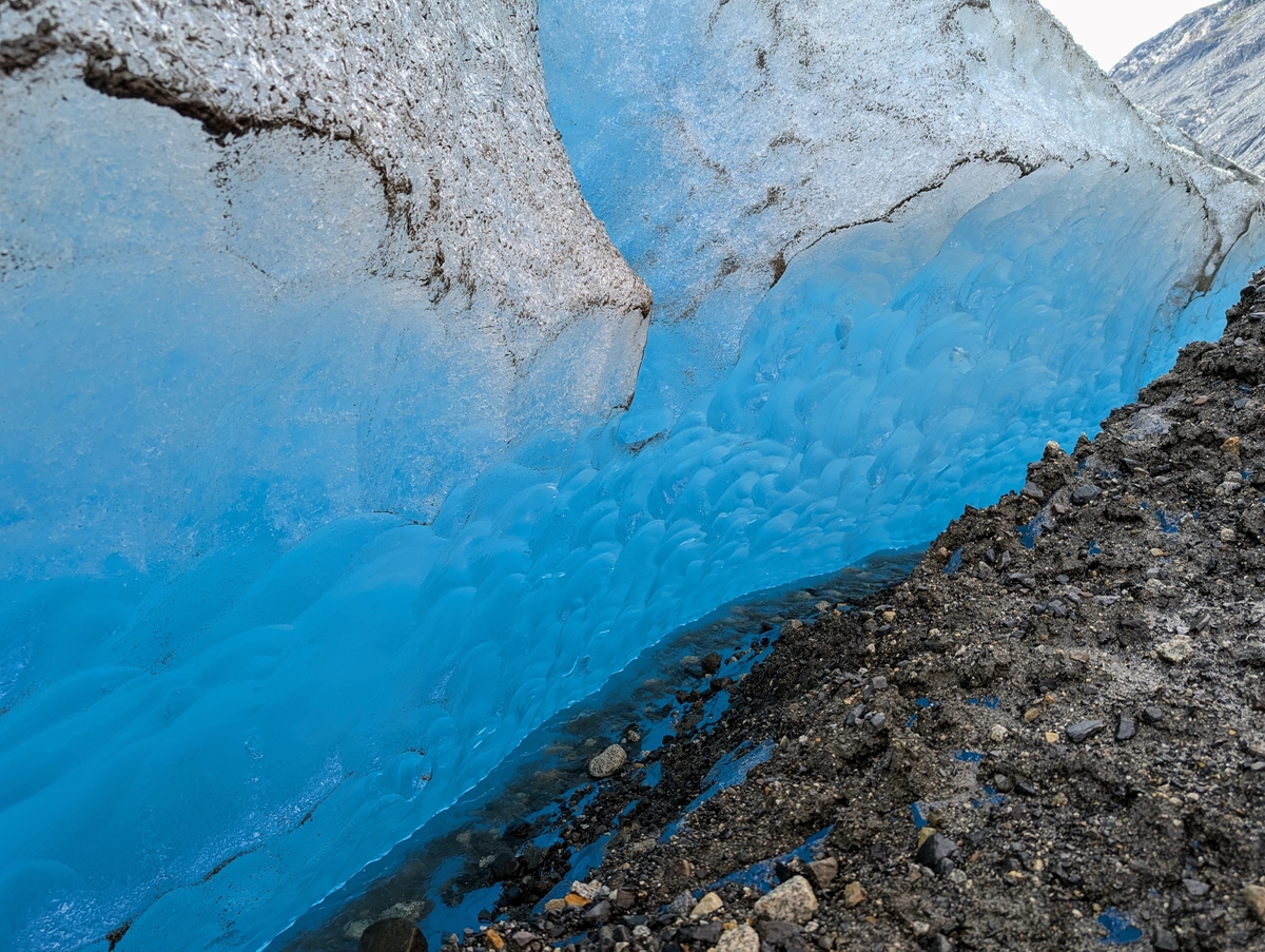 ガイドの1人によると氷河は1日2~4センチメートル動いているとのこと。平均の3センチメートルとして、1年に直すと約11メートル。スイスで見たアルプス最大の「アレッチ氷河」が1年で200メートルとのことでしたから、それよりもずいぶん遅いですね。