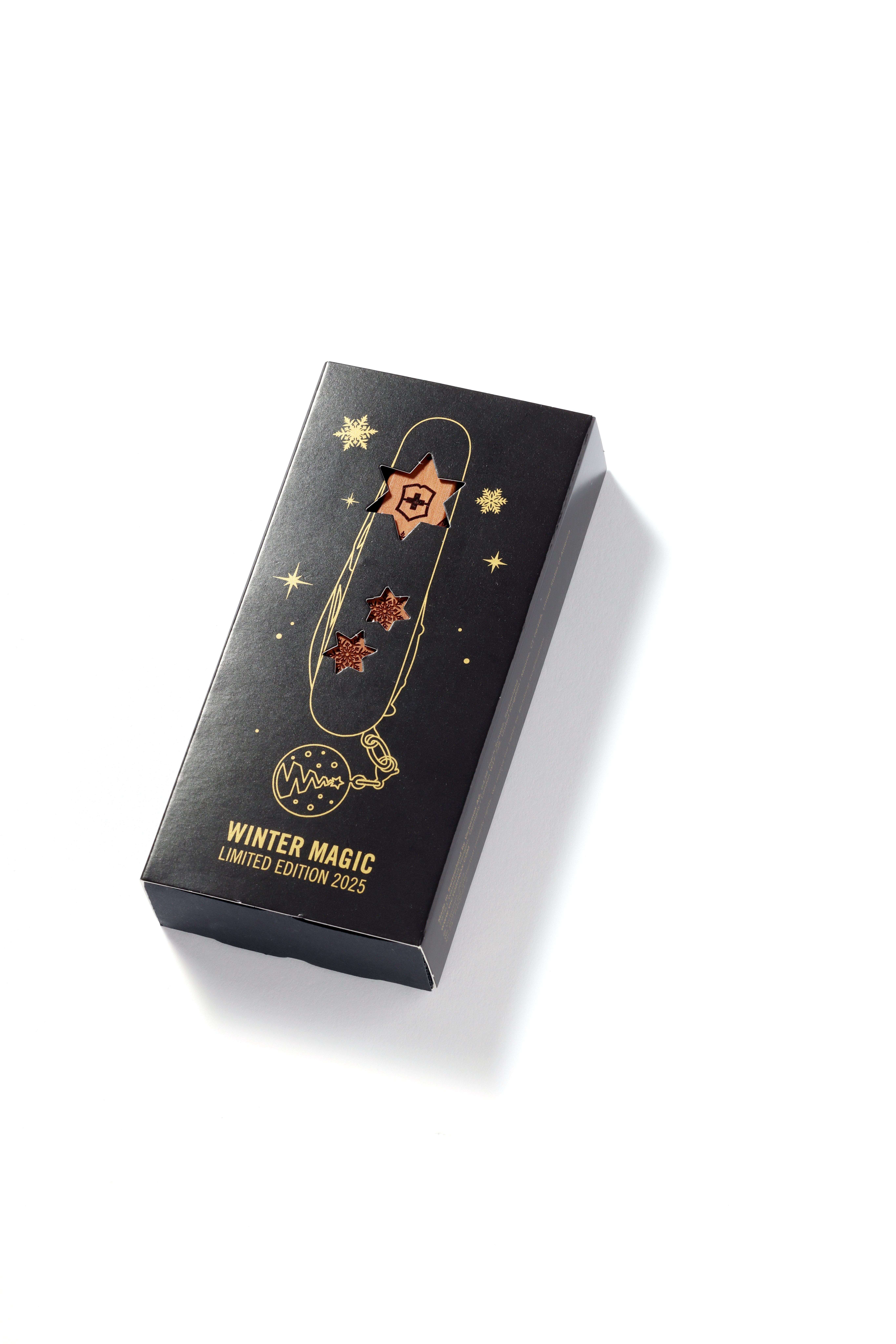ぬくもりの感じられる木の表面に、流れ星と雪の結晶が細やかに刻まれている。キーリングには、こちらも流れ星をモチーフにしたペンダントチャームが付属する。冬の澄んだ夜空を見上げたい。降り積もる雪とたわむれたい―—。そんな気持ちにさせてくれる限定品だ。