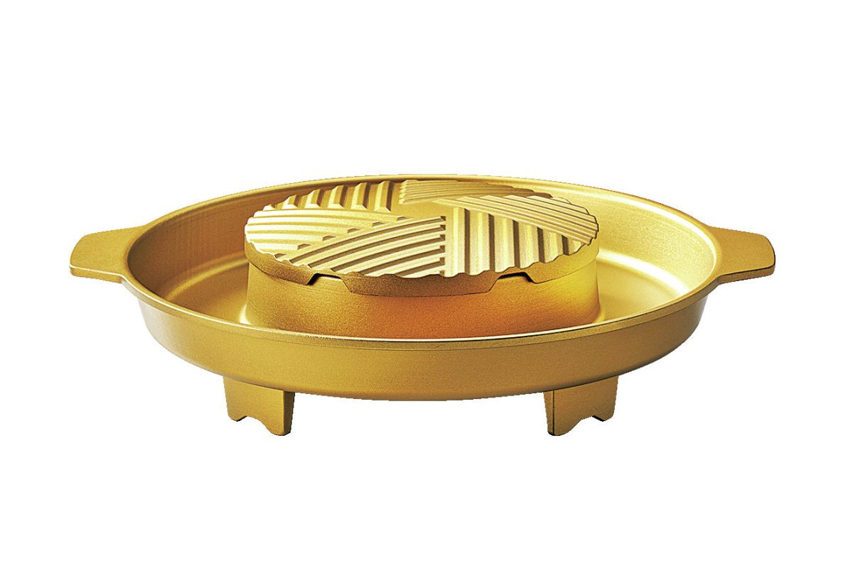 イワタニのカセットこんろ専用に設計されたアルミ合金製鍋。上は肉や魚を焼いて、下は鍋料理などを煮込んで食べられる。フッ素コーティングで手入れしやすいのもポイント。