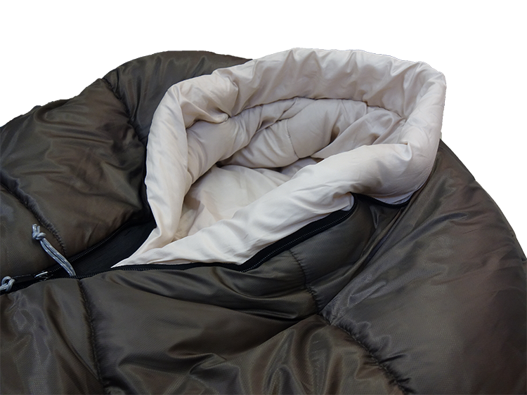 マミー型なのに前面にセンタージッパーを備え、出入りがしやすいのはもちろん、手足を出したまま動けるのがこのモデルならではの工夫。ふっくらモフモフの中綿が、冬キャンプをやさしく包み込んでくれる。