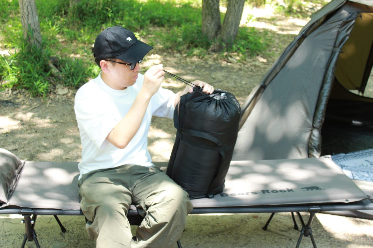 付属の「しろくまん圧縮袋」に入れ、下方向にベルトをぐっと締めていけば、かさばりがちな冬用シュラフもコンパクトに。車のラゲッジや自宅の収納スペースにもすっきり収まりやすい。