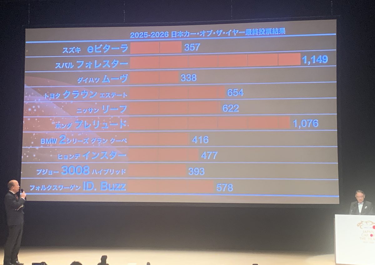 BE-PALも実行委員を務めている「日本カー・オブ・ザ・イヤー」の最終選考会が12月4日に横浜市のBOSCHホールで開催され、「2025~2026 イヤーカー」にスバル フォレスターが選ばれました。