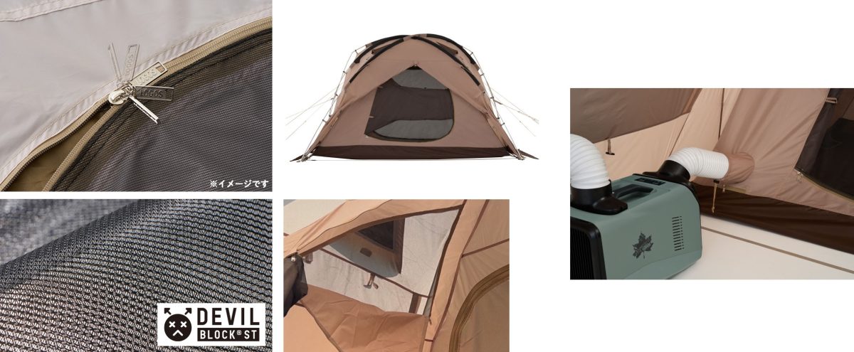 入り口は手を持ちかえることなく一気に開閉が可能なロゴス独自の「回転式ジッパー」のほか、UVカット率・遮光率ともに通常比約1.5倍で小さな虫の侵入も防ぐ高機能メッシュ「デビルブロックST」を採用。
