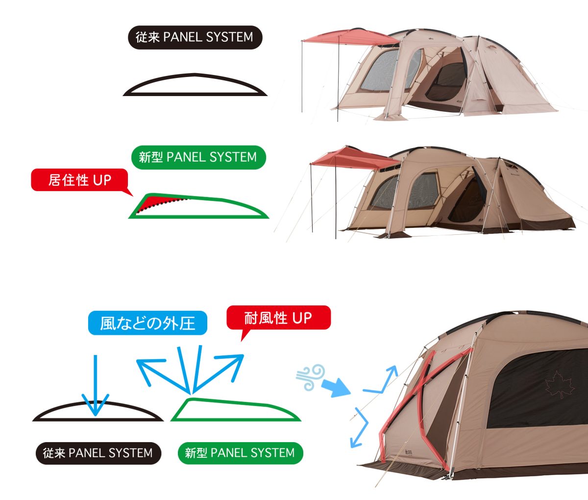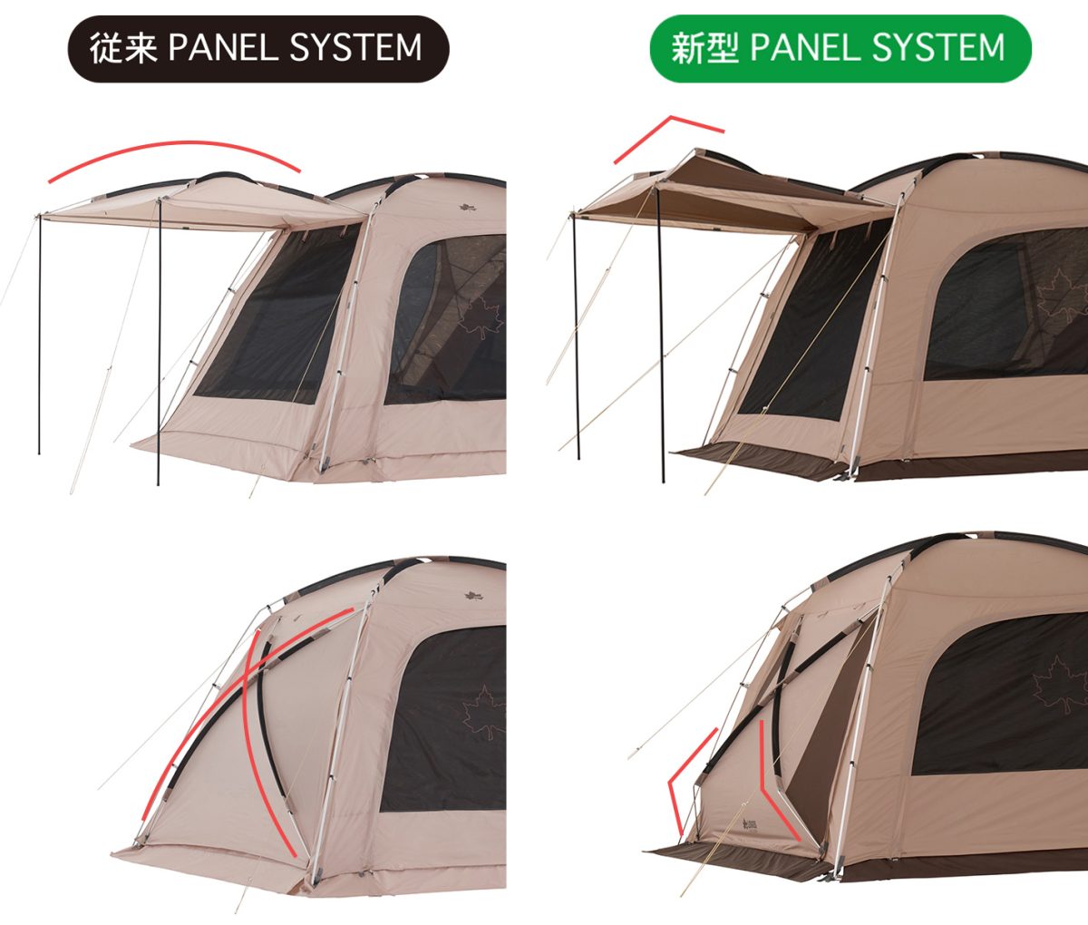 PANEL SYSTEMはドアパネルに2本のポールをクロスさせたロゴスの独自機能だが、今回はクロス状に組み込んだフレームを湾曲させ、角度をつけた新型が採用されている。