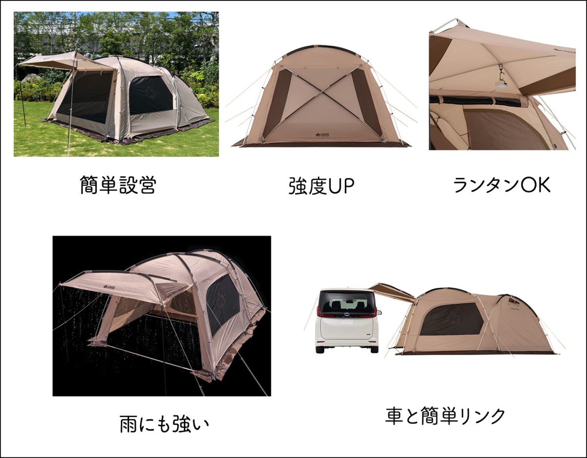 従来モデルのようにクロス状フレームで全体の強度を高めつつ、角度のあるトップ部分を支点にフレームが左右に開く力を働かせることで外部からの圧力を分散。天候の影響を受けにくい耐風性に優れた構造となっている。