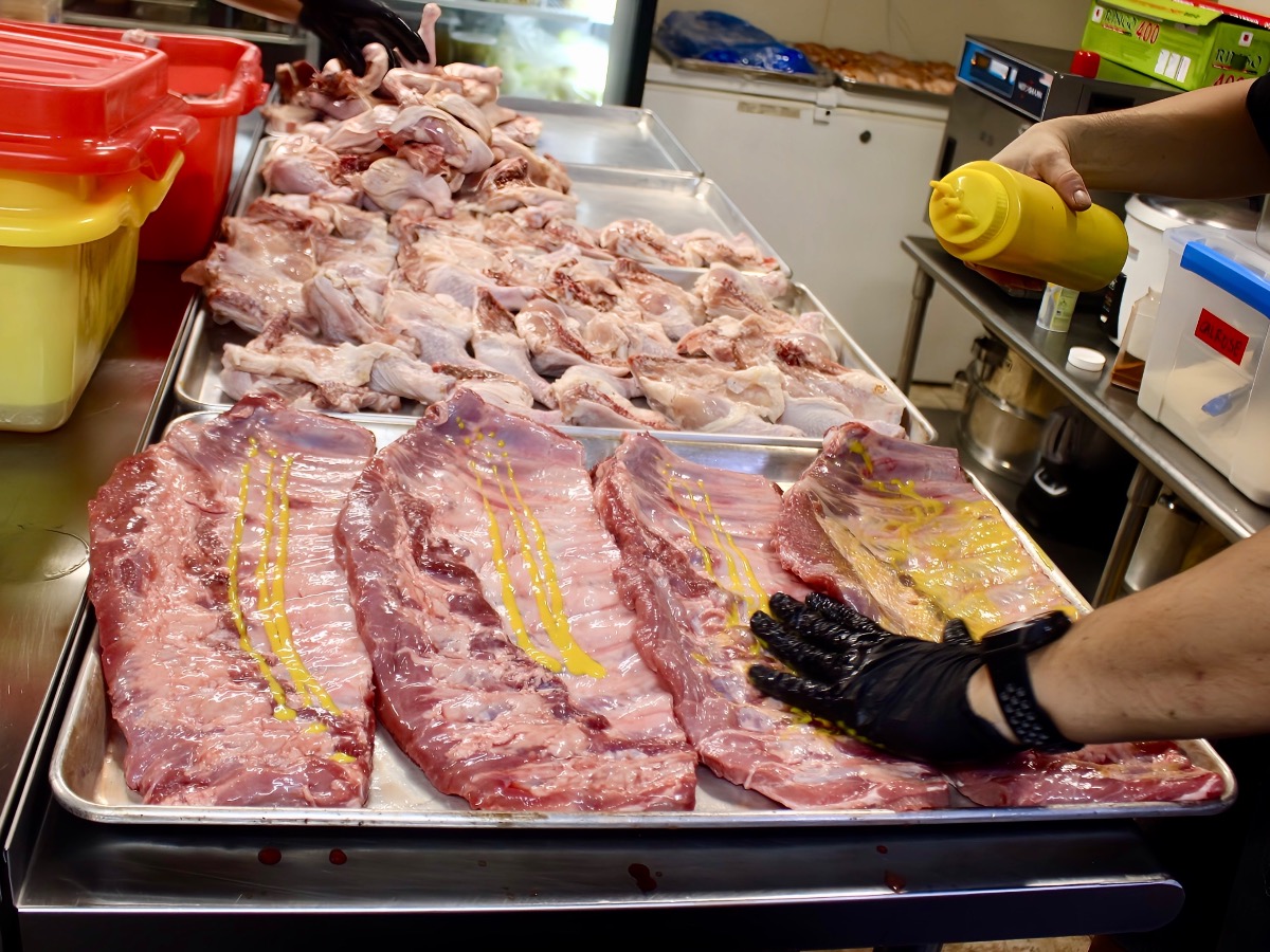 2. BBQラブがなじみやすくなるよう、肉の表面にイエローマスタードを塗る