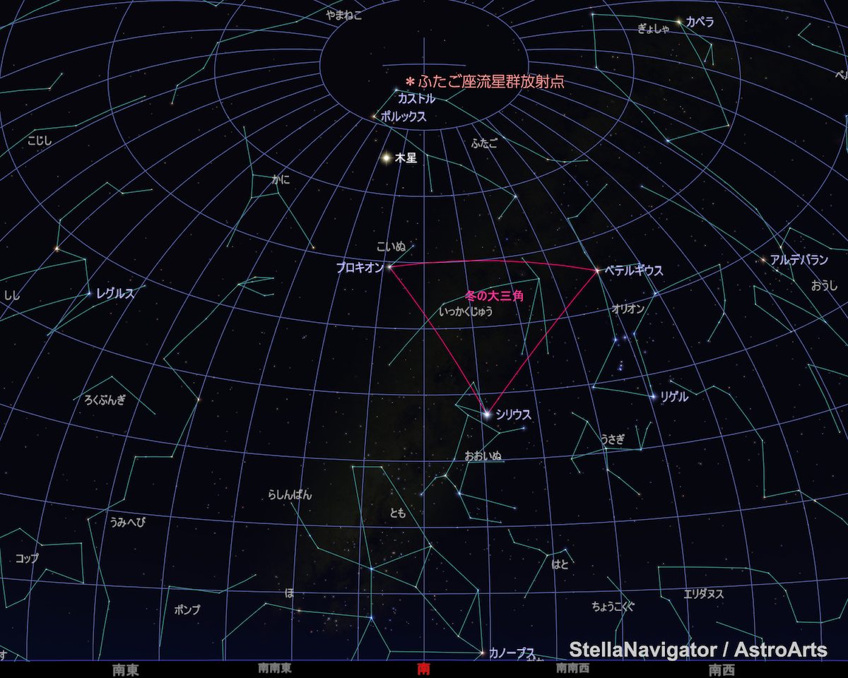 今年はふたご座の中に明るい木星がいます。23時頃には冬の星座たちも勢ぞろい。キラキラの星空に流れ星が飛ぶ、すばらしい夜が楽しめそうです。