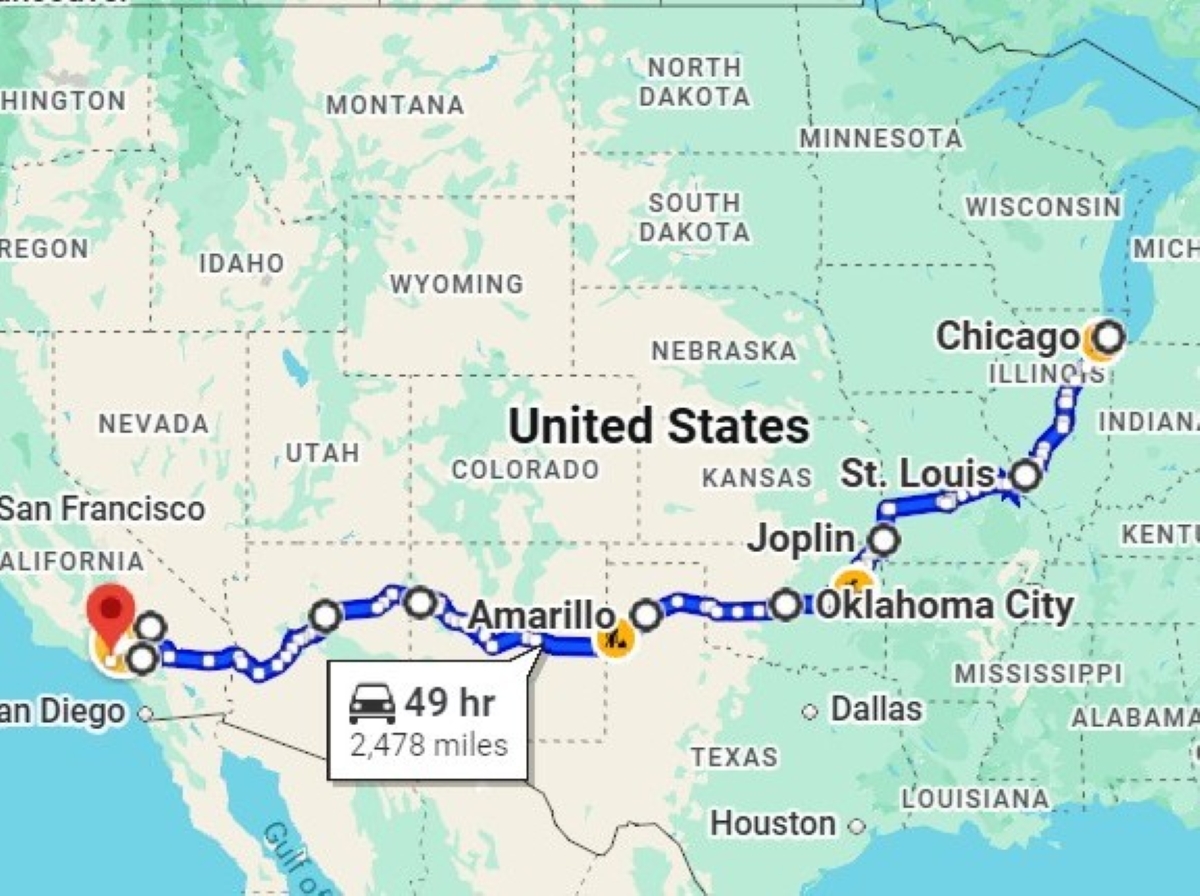 ルート66の起点はイリノイ州シカゴ、終点はカリフォルニア州ロサンゼルスです。8つの州とたくさんの町を通り抜け、全行程の距離は約4000kmに及びます。