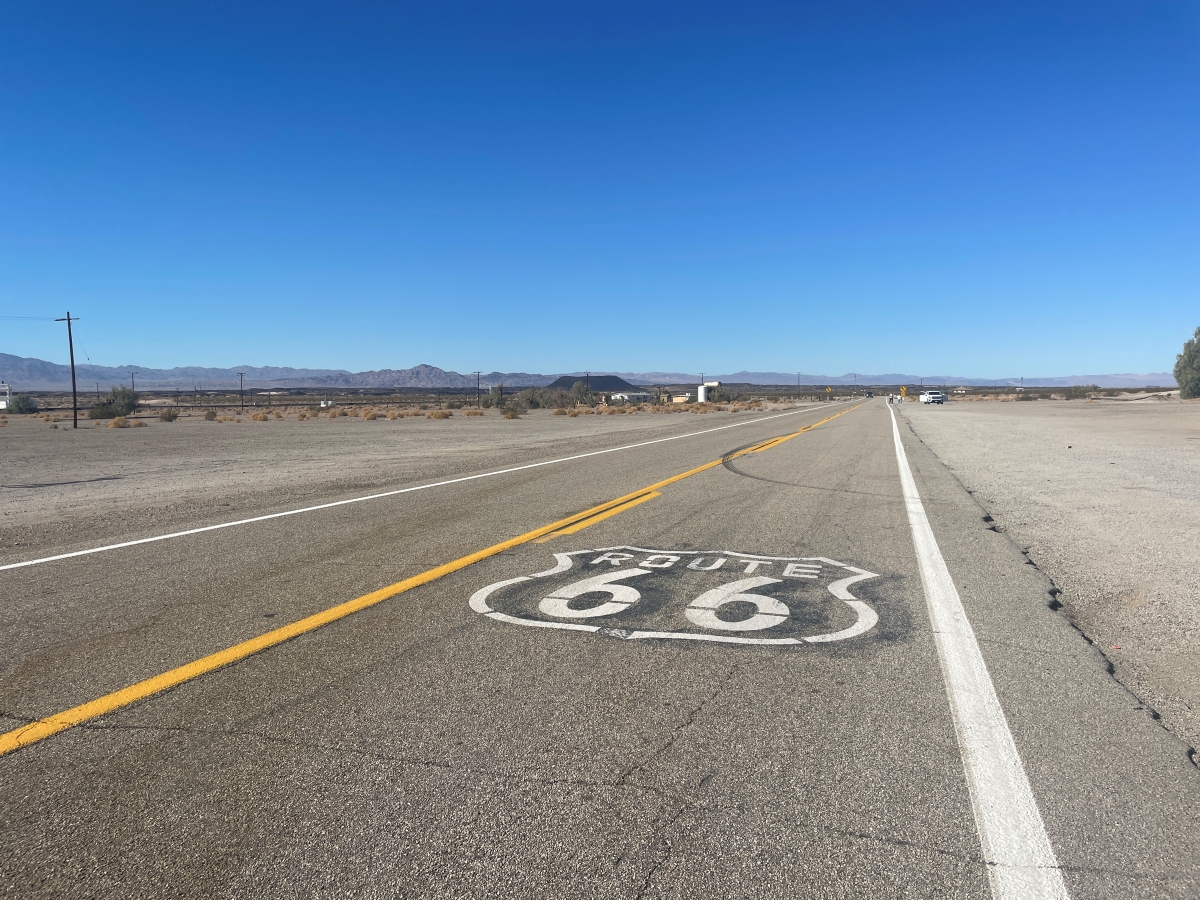 ルート66最終地点の標識があるサンタモニカ・ピアはロサンゼルス国際空港のすぐ近くです。そこから太平洋に背を向けて東に向かうと、都会から山脈を越え、やがて砂漠へと風景が変わっていきます。