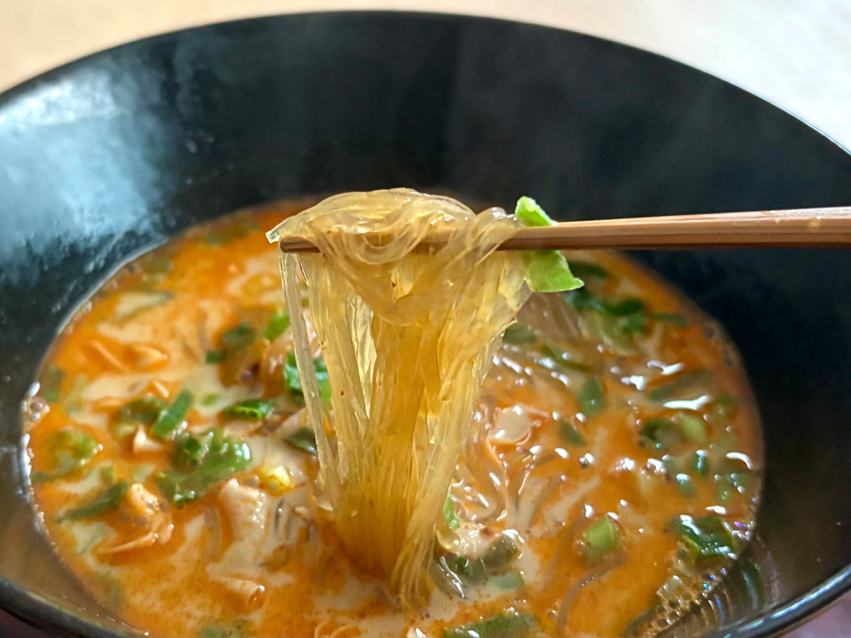 内野さんによると、春雨麺はお湯が沸騰していなくてもプルプルもちもちになるそうです。