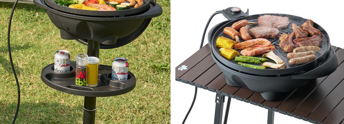 「ファミリーエレグリル」は、調味料や飲み物が置けるカップホルダー付き。グリル部分をスタンドから外せるため、卓上BBQグリルとしても使える。