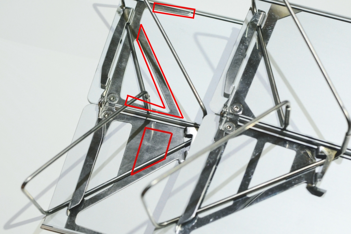 そしてその天板を裏で支える板金の厚さは-0.2mm薄くすることに成功。さらに、上の写真の赤枠部分を肉抜きするという徹底した軽量化が施されています。