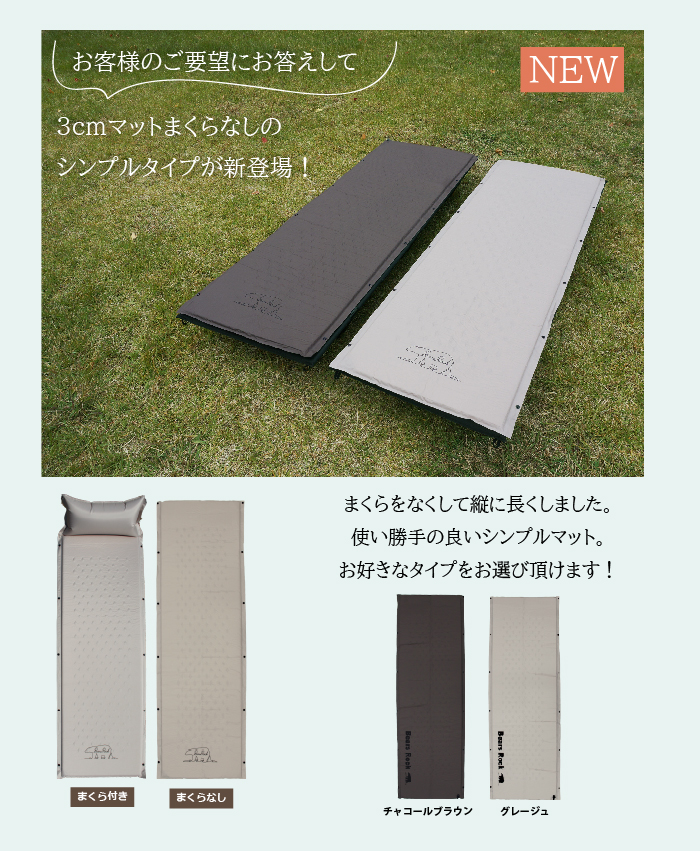 これまで展開してきた「3cmキャンプマット」の“まくら付き”モデルは、手軽に使えて頭部まで安定して支えられるため、初めてのキャンプでも扱いやすいと人気だ。