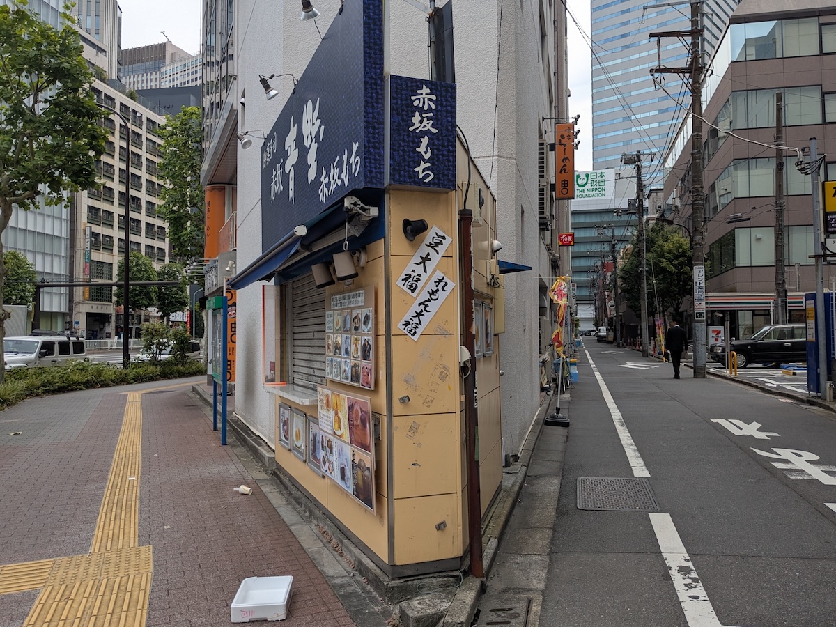 さて、赤坂方面に向けて歩いていると、個人的にグッと来る建物が目に留まりました。いわゆるY字路の狭小建物です。調べると、意外にも(といっては失礼ですが)1899年(明治32年)創業の老舗和菓子屋「赤坂青野」でした。