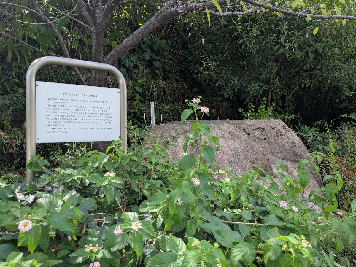 長柏園(ちょうはくえん)は、明治から大正にかけて活躍した造園家である長岡安平(ながおかやすへい)の屋敷(跡地)です。西洋式の公園がどんなものか知られていなかった時代に、長岡安平は独自の考えでさまざまな公園を手掛け、近代造園の先駆者とも称されました。隣接するもみじ谷も、長岡安平の設計によるものです。