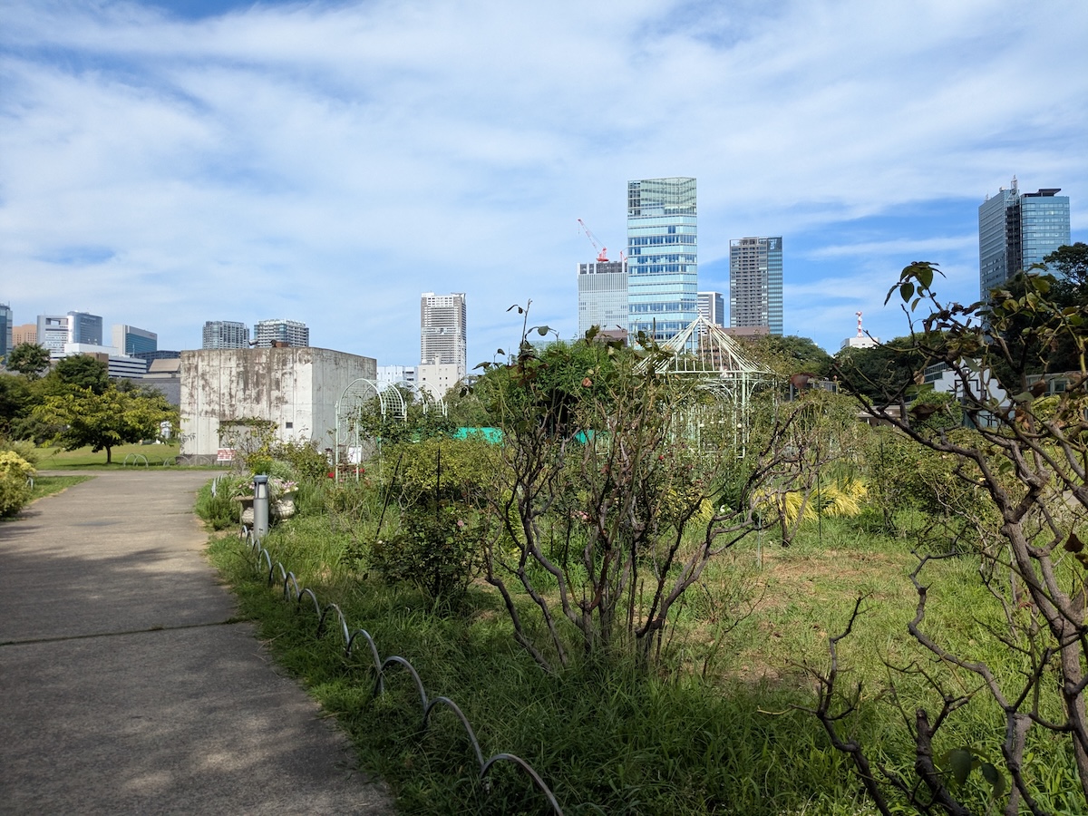 芝公園の脇の歩道を通り、「ザ・プリンス パークタワー東京」に続く道を進んでいきます。緑に囲われた気持ち良さそうな道を歩いていくと、徐々に樹影が濃くなっていきます。すると、開けた空間に出ました。芝生の広場とイングリッシュガーデンのような庭が広がっています。
