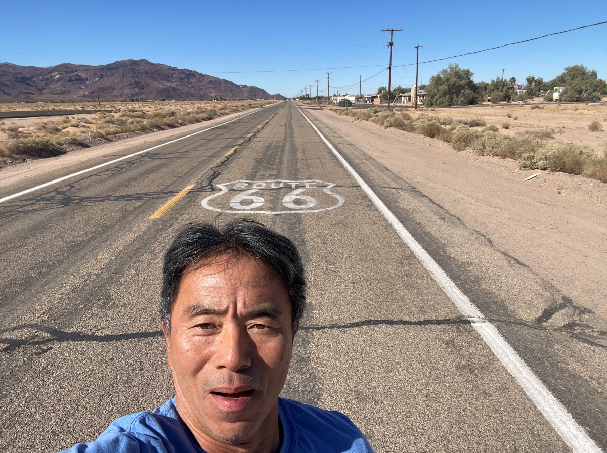 バグダッド・カフェの前を通るルート66でセルフィ―撮影に興ずる筆者。