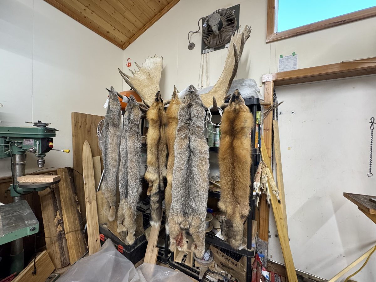キースの工房の一角。ヘラジカの角に乾燥中の毛皮がかけられている。大きいほうがオオヤマネコで、小さいほうはキツネ。全てキースが獲った。